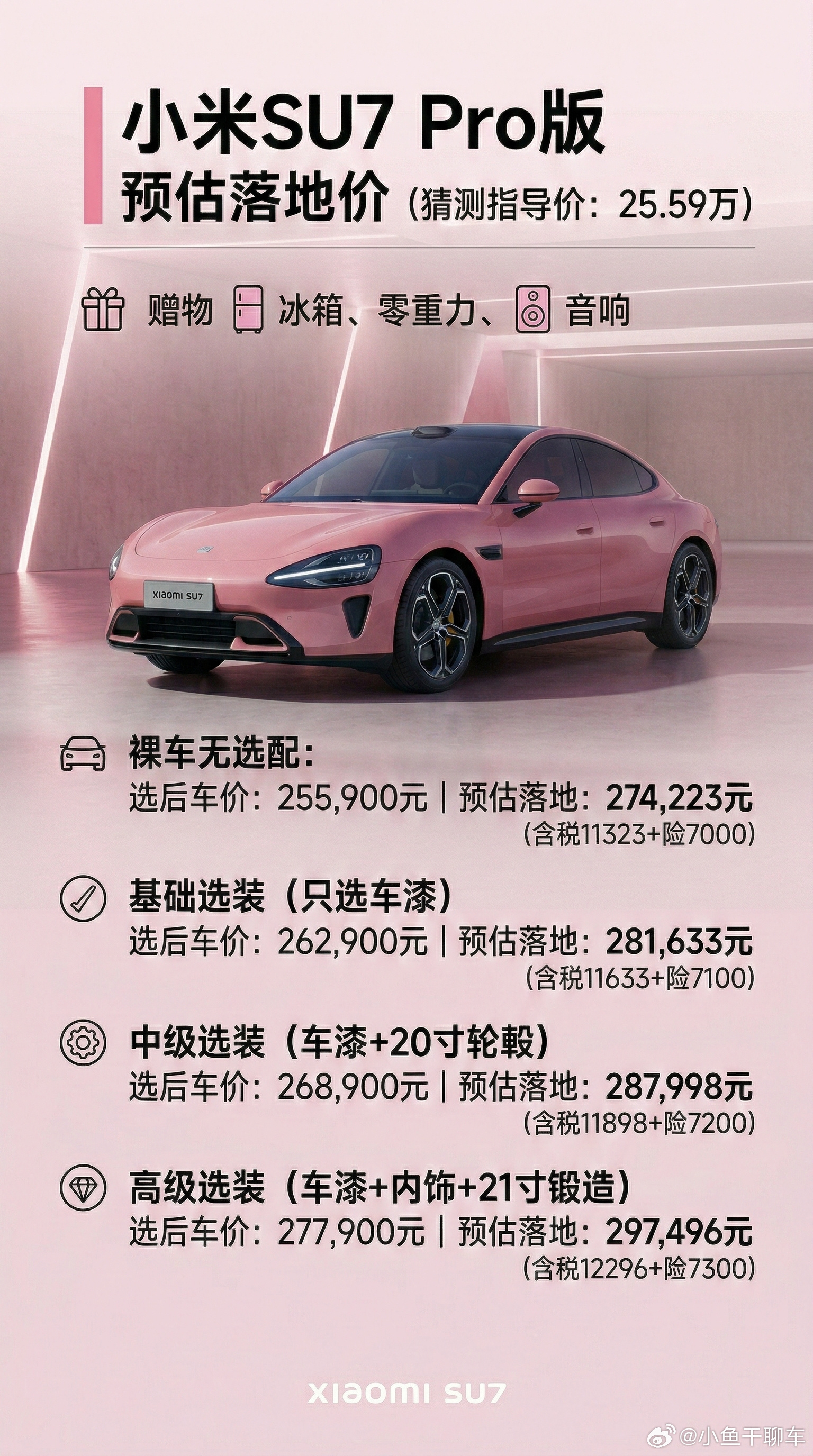 新款小米SU7全系落地价格清单整理好了,根据预售价做的一个比较稳的落地价整理,大家可以参考一下