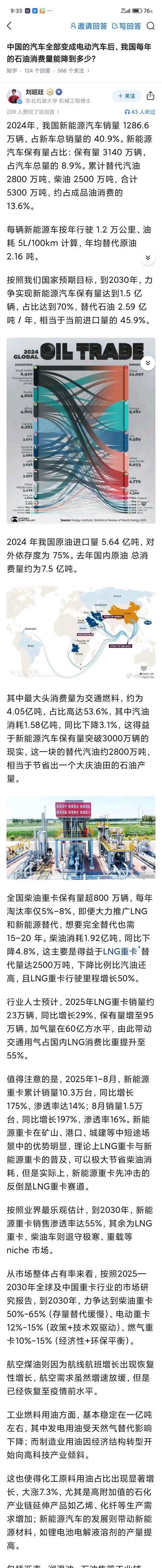 中国的汽车全部变成电动汽车后,我国每年的石油消费量能降到多少?2024年中国石油使用量约7.5亿吨,消费量趋于饱和,原油进口量5.53亿吨,同比下降1.9%,进口金额2.31万亿元,占我国进口贸易总额的12.56%,假如能把原油使用量降低到2亿吨,那我们就不需要进口原油了。 2024年全国石油表观消费量实际是7.56亿吨,跟大家常说的差不多,消费已经进入饱和阶段。国内原油产量稳在2.13亿吨,进口5.53亿吨,比前一年少1.9%。成品油消费3.9亿吨,同比降1.7%,主要因为新能源汽车销量猛增,LNG重卡也在替代柴油。这数据来自中石油经研院报告,挺靠谱的。 交通领域是石油大头,汽油消费接近1.58亿吨,大多来自乘用车,柴油里公路运输占大比例。要是全国汽车全换成电动,乘用车汽油基本不用了,轻型车柴油也能省不少。按当前结构估算,这一块能直接砍掉1.6亿到2亿吨石油当量,总消费量可能落到5.5亿吨左右。充电桩代替加油站,道路上车流充电场景会越来越常见,成品油需求曲线就往下走。 可石油不光用来开车。炼油过程产出大量石化原料,经过裂解重整这些工序,做出乙烯丙烯这些基础化学品,再做成合成纤维、塑料颗粒。合成纤维是衣服面料主力,塑料到处用在包装和日用品。化工用油占比现在已经到四分之一左右,而且还在涨。航空煤油得给飞机加,船舶柴油维持货轮跑,工业上也有固定需求。即使汽车全电动化,这些用途的原油加工量还得留着,炼厂塔罐和管道不会闲置。石化产业链稳不住,衣服塑料这些日常东西就跟不上,所以消费总量降不到2亿吨。国内产量刚好2亿多吨,进口肯定还会有一部分,依赖不会一下子清零。 再说能源安全。石油进口主要走海路,得过霍尔木兹海峡、马六甲海峡、台湾海峡这些咽喉要道。万一这些地方出状况,油轮进不来,供应就紧张。电力就不一样,发电靠本土煤、水、核、新能源,电网调度全在自己手里,工厂和居民用电基本不受远洋航线影响。电力成了实打实的稳定保障,21世纪的底气就在这儿。 总的看,电动汽车普及让石油消费增速放缓,进口压力减轻不少。但完全把原油用量压到国内产量水平,还得靠石化结构继续优化和电力多顶上。咱们一步步来,能源安全和日常需求两头兼顾,才是长远路子。