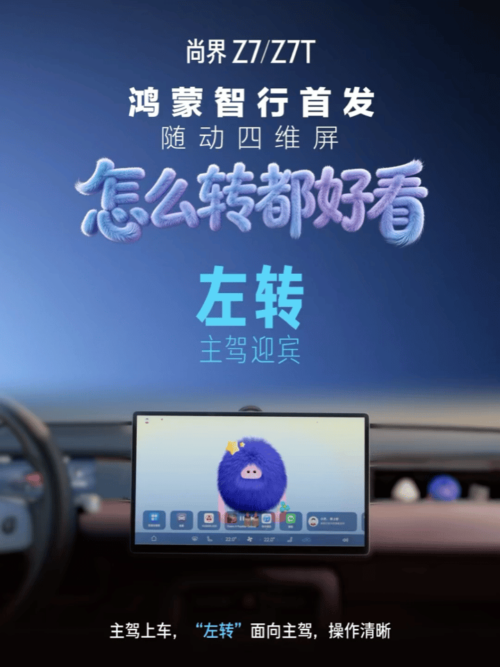 余承东首曝尚界Z7内饰亮点尚界Z7的随动四维屏,堪称鸿蒙智行在智能交互领域的又一创新力作!区别于市面千篇一律的固定大屏,它以可伸可转的灵活设计,精准兼顾主副驾的不同用车需求,导航时贴合主驾视野提升行车安全,娱乐时适配副驾视角拉满体验感,多种交互方式还能满足年轻人的新鲜感。从冰冷的操作面板到懂人的智能伴侣,尚界Z7四维屏情绪价值拉满。