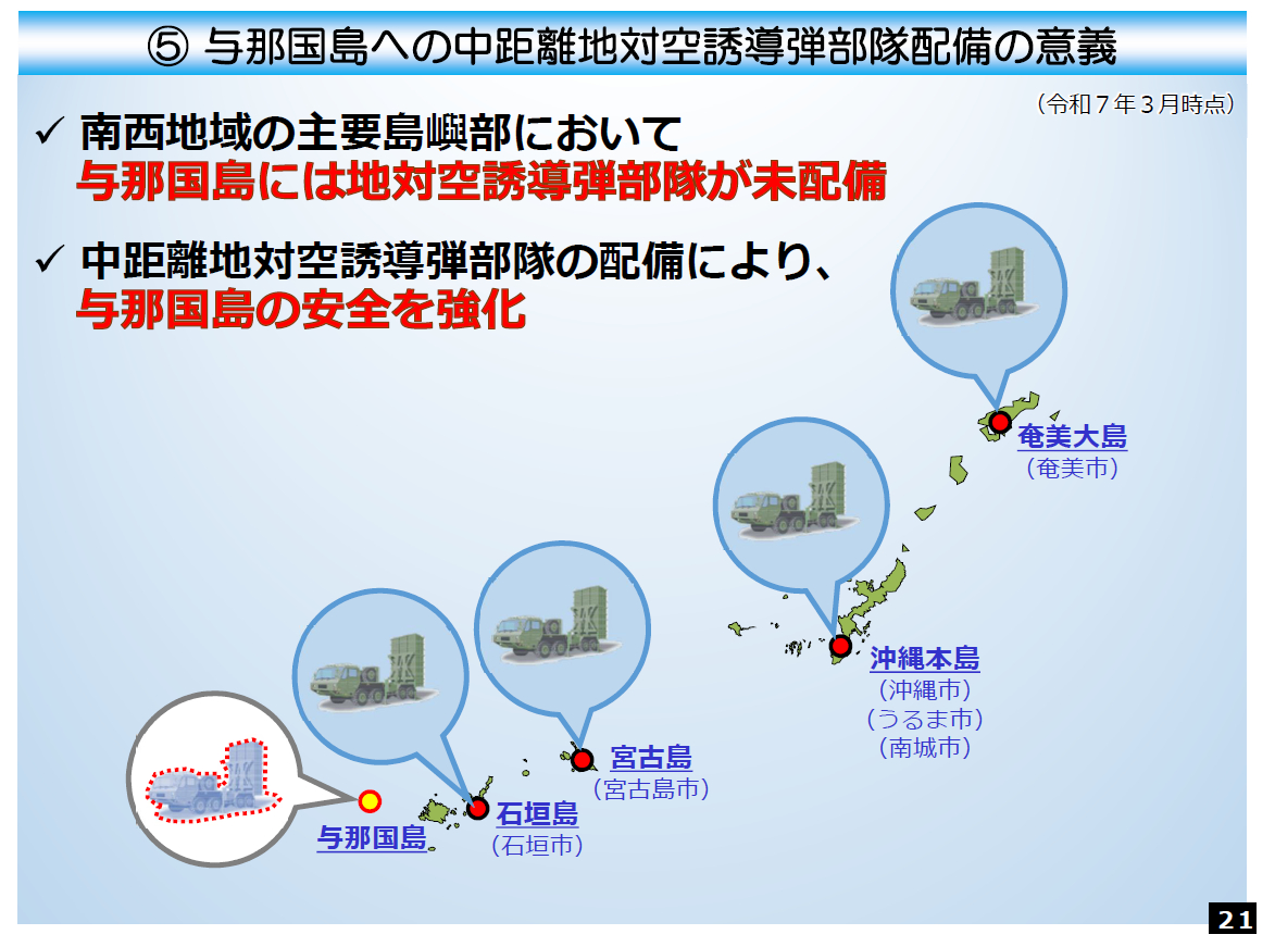 日本自卫队计划在2030年向距离中国台湾100多公里的琉球与那国岛部署防空导弹部队,根据自卫队发布的部署说明文件,其针对的假想敌明确是朝鲜和中国大陆,自卫队计划配备的是还处于开发中的“改进型03式中程地对空导弹增强型”(03式中SAM(改)能力提升)防空系统,相比现役的“改进型03式中程地对空导弹”(03式中SAM(改)),增强型将具备拦截弹道导弹(BM)、高超音速滑翔飞行器(HGV)和隐身战机的能力。