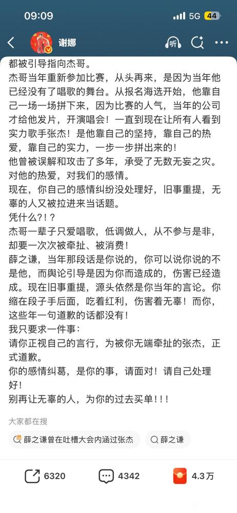 谢娜一纸长文把桌子拍得震天响,指着薛之谦的鼻子要他低头认错,结果人家装聋作哑连个眼神都没给。 你设身处地想想这事有多憋屈。早年薛之谦在台上撇着嘴甩包袱,说自己没找比自己红的女朋友帮忙。网民立刻把这盆脏水泼在张杰身上,指着鼻子骂他靠老婆上位,硬生生戳了他十几年脊梁骨。谢娜看着张杰从海选一路拼上来流的汗,全都砸在这句随口乱飞的段子里,她根本咽不下这口气。 这几天李雨桐抖出薛之谦重婚的惊天烂账,看客们趁乱又死死揪住张杰扯皮。谢娜直接扯开嗓子发飙,要薛之谦自己出来把当年造的孽收拾干净。张杰也立刻站定立场,甩出原话证明自己干干净净单身坦坦荡荡唱歌。可薛之谦呢,扔出一张轻飘飘的律师函去堵前女友的嘴,直接把谢娜的怒吼当成了耳旁风。 娱乐圈这摊浑水里,没有谁能靠抖机灵一直笑到最后。这名利场里的恩怨,从来不是你红口白牙随口一扯的段子,而是别人实打实咽进肚里的刀子。