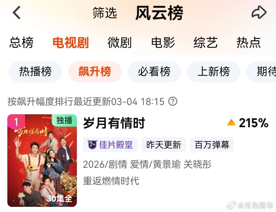 超点第二天飙升还有215%,真是口碑发酵,这年头还有男主跑了一路跟女配结婚的剧吗?这不就来了~~给没见过世面的娃娃们长长见识,上上强度。人生努力追求,也不一定能获得,获得不了也不是什么大不了的事,只要尽力了就不要后悔,学会放下,选择自己新的生活,格调如此之高电视剧岁月有情时