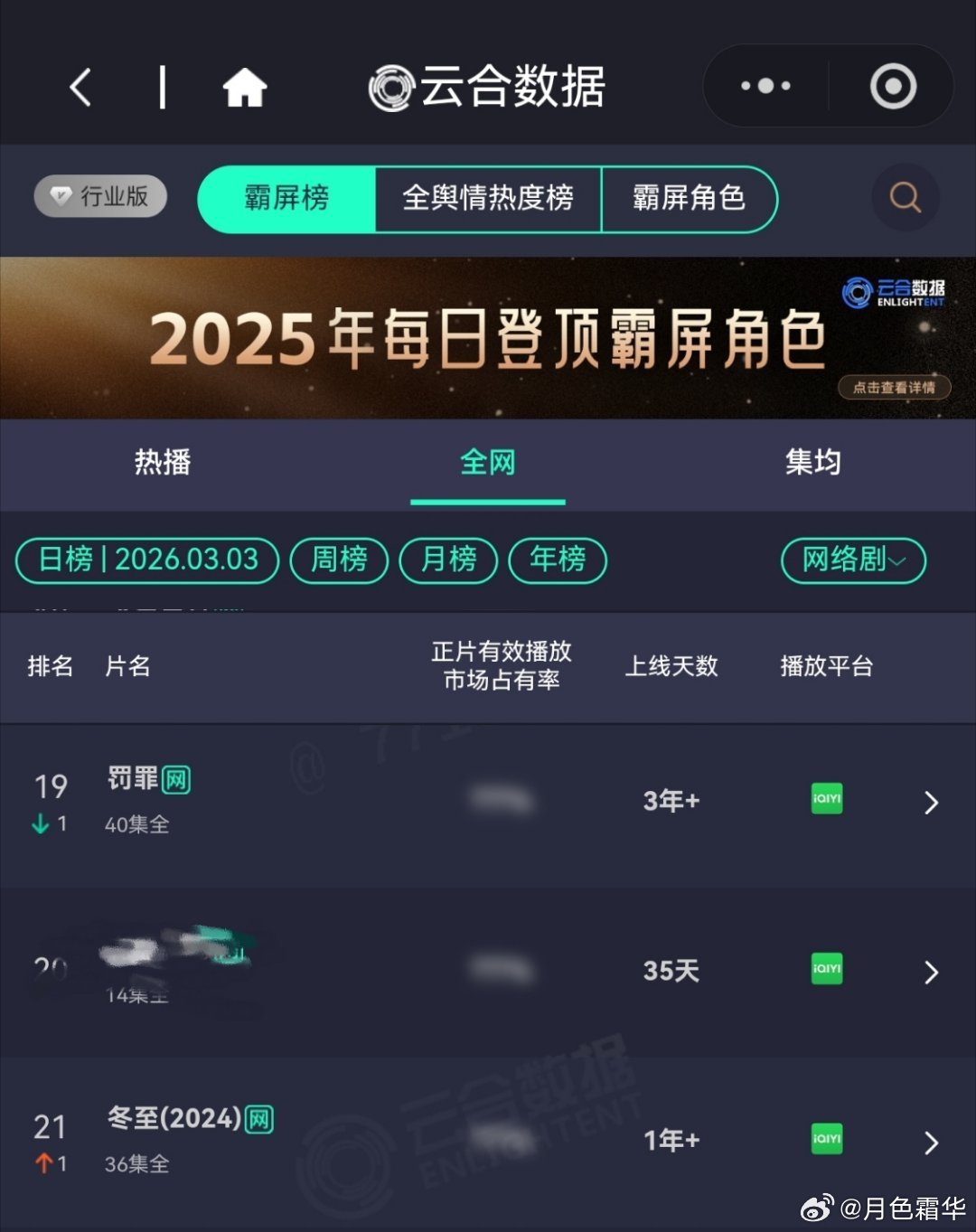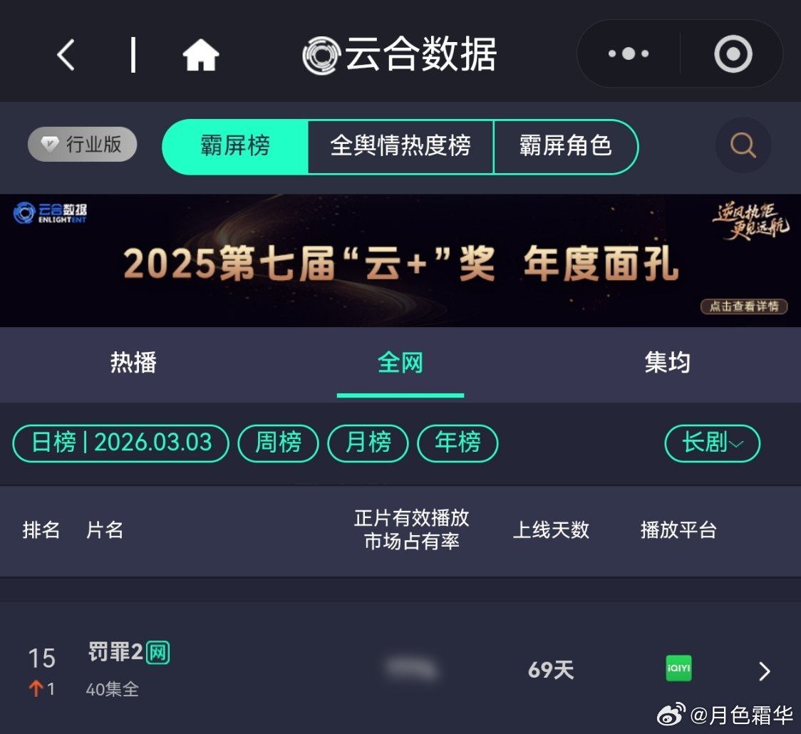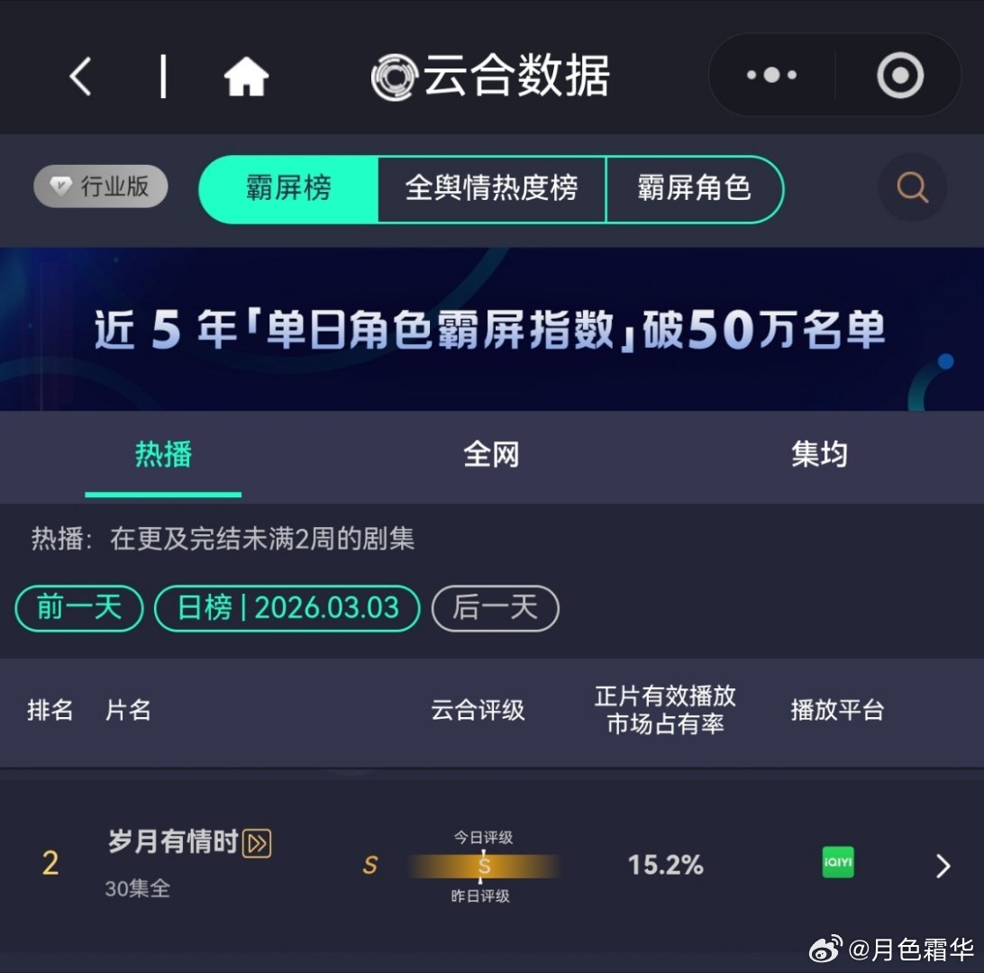 3月3日,黄景瑜岁月有情时 开播第12天,超点,云合第2🎆🎆🎆,霸屏榜黄景瑜张小满 第2,酷云全端第2。黄景瑜罚罪2 云合热播期结束第17天,上线第69天,全网第15🎆。黄景瑜秦枫 ,罚罪,网络剧榜第19,冬至第21。