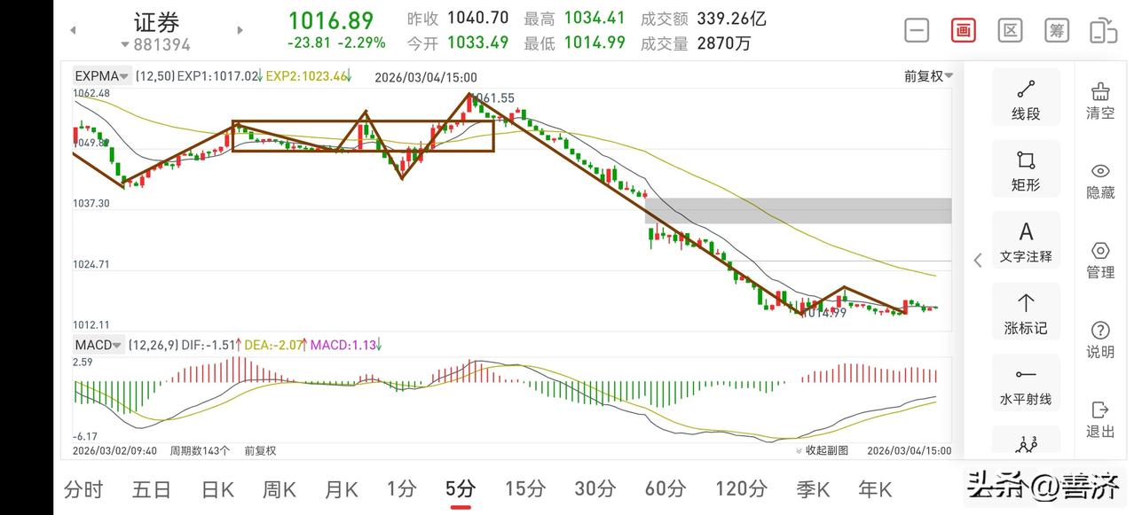 证券板块复盘(2026.3.4) 今天下午证券板块维持了一个小幅震荡格局,这和上午的预期是一致的,由于今天下跌力度比较大,此处跌幅虽有所缓和,但不急于操作,可继续考虑持股观察。 1.从30分钟图一上看,目前正在走一个横盘整理,在小幅震荡后,还是有很大概率继续下探的,因为今天力度较强,不排除明天还有余波,所以明天可考虑继续观察一天。 2.从5分钟图二上看,目前正在构建5分钟中枢,待构建完成后,需站上5分钟中枢上沿并回踩不破新低时再考虑操作,目前并不具备操作条件,待结构明确后再考虑操作也不迟。 总之,在大跌之后不太可能立马会拉出大阳线实现反转,更大的可能是在此处做小幅震荡后再逐步向上修复的过程,所以在操作上不宜操之过急。预计在两会政策明了后才会逐步向上修复。集卡领红包 证券板块解析