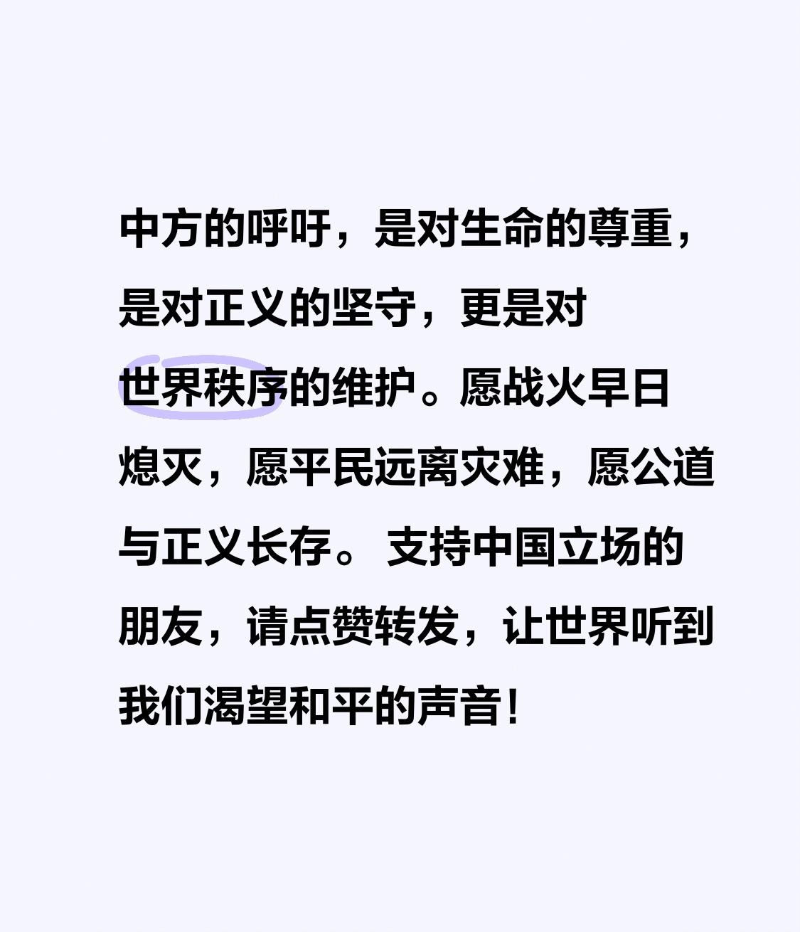 重磅!中方紧急呼吁:立即停止军事行动,一句话震动全球! 所有关心中东局势的朋友,这条视频一定要看完、转发!战火越烧越猛,平民伤亡不断,就在全世界都揪心的时刻,中国正式发声,立场坚定、态度鲜明,给混乱的中东带来和平希望! 近期伊朗多地遭遇密集空袭,港口瘫痪、设施被毁,无辜百姓在炮火中流离失所,家园变成一片废墟。冲突持续升级,战火不断外溢,霍尔木兹海峡告急,全球能源、航运、股市全线震荡,再不停火,整个中东都可能滑向全面战争的深渊! 危急关头,中国站了出来!王毅外长明确发声,中方呼吁立即停止军事行动,反对使用武力、尊重各国主权、保护平民安全,敦促各方立刻回到谈判桌前,用对话解决分歧。在联合国安理会上,中国代表接连表态,主持公道、伸张正义,坚决反对单边行径,坚决维护国际法秩序。 很多人以为这只是普通外交表态,大错特错!这是转折点!一边是战火不断升级,一边是中国全力劝和促谈。我们不选边、不站队,只站在和平一边、站在正义一边、站在平民一边。中方反复强调:武力解决不了任何问题,只会制造更多仇恨与灾难,和平谈判才是唯一出路。 从呼吁停火、保护同胞,到推动安理会紧急会议,中国始终以负责任大国姿态,为降温灭火奔走努力。我们不煽风点火、不趁火打劫,更不拱火递刀,这就是中国担当、中国格局! 看着战区里无助的老人、哭泣的孩子,我们才真正懂得:和平从来不是天上掉下来的,弱国无外交,落后就挨打。我们不是生活在和平的时代,只是生活在和平的国家。 中方的呼吁,是对生命的尊重,是对正义的坚守,更是对世界秩序的维护。愿战火早日熄灭,愿平民远离灾难,愿公道与正义长存。 支持中国立场的朋友,请点赞转发,让世界听到我们渴望和平的声音!