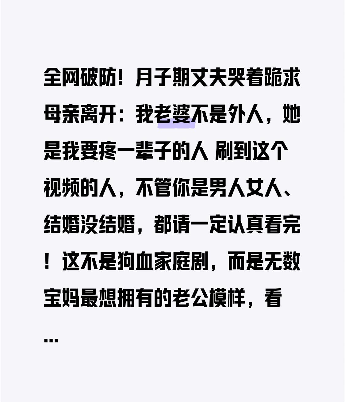 全网破防!月子期丈夫哭着跪求母亲离开:我老婆不是外人,她是我要疼一辈子的人 刷到这个视频的人,不管你是男人女人、结婚没结婚,都请一定认真看完!这不是狗血家庭剧,而是无数宝妈最想拥有的老公模样,看完真的忍不住流泪! 一位刚生完宝宝的妈妈,还在最脆弱的月子期,本该被细心呵护,却因为婆婆的过度插手,天天委屈落泪、整夜失眠。婆婆打着“为你好”的旗号,强行喂饭、强行捂汗、不准洗澡、不准开窗,甚至连怎么带娃、怎么喂奶都要全盘控制。 媳妇忍了又忍,不敢顶嘴,只能偷偷掉眼泪。身体的痛、心里的委屈,快要把一个刚生产完的女人压垮。 谁也没想到,真正的转折点来了! 一向孝顺的丈夫,看着老婆日渐憔悴、情绪崩溃,终于忍不住了。他没有和母亲吵架,而是红着眼眶、声音哽咽,当着全家人的面,哭着求自己的母亲离开。 他说:“妈,我知道你辛苦,我知道你为我们好,但她刚生完孩子,她怕热、她难受、她委屈!她是我老婆,是我孩子的妈妈,不是来咱家生孩子的工具!你再这样下去,这个家就散了!求你先回去,让我们安安静静过月子!” 一个大男人,当着母亲的面哭到发抖,这一幕,瞬间戳中无数人的心。 没有偏袒、没有愚孝、没有冷暴力,他清清楚楚地站在妻子这边,护着那个为他生儿育女、九死一生的女人。 网友们纷纷留言:月子之仇,不共戴天;而护妻的丈夫,能治愈一切委屈。 其实女人要的从来不是大富大贵,而是在最脆弱、最无助的时候,有个人站出来说:别怕,有我。 多少婚姻,不是败给了没钱、没房,而是败给了月子里的冷漠、婆家的不尊重、丈夫的不作为。 一个真正的好男人,永远懂得:先疼小家庭,再顾大家;先护妻子,再孝父母。 愿每一位刚生完宝宝的妈妈,都能被温柔以待;愿每一个女人,都能遇到那个拼了命也要护你周全的人。 婚姻最好的模样,不过是:我为你生儿育女,你为我遮风挡雨。 如果你也被这个丈夫感动,点赞转发,愿所有宝妈都能被善待!