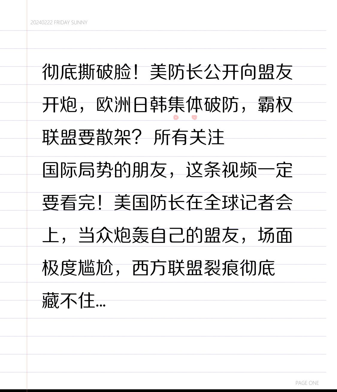 彻底撕破脸!美防长公开向盟友开炮,欧洲日韩集体破防,霸权联盟要散架? 所有关注国际局势的朋友,这条视频一定要看完!美国防长在全球记者会上,当众炮轰自己的盟友,场面极度尴尬,西方联盟裂痕彻底藏不住了! 当地时间3月2日,美国防长赫格塞思火力全开,一边宣布对伊朗军事行动将废除“愚蠢的交战规则”,不再讲政治正确,一边直接把矛头对准欧洲盟友,怒斥他们只会大惊小怪、束手无策,动武时支支吾吾,根本不是可靠伙伴。这番话一出,全球哗然,谁也没想到美国会如此不给盟友留面子。 更狠的是,这不是临时发火,而是美国的全面清算。近期美防长跑遍全球,挨个施压:要求欧洲、日韩把军费大幅提高,甚至喊出GDP5%的目标;听话的给优待,不听话就威胁“付出代价”;一边要盟友当打手,一边又嫌弃他们拖后腿。 转折点来了!很多人还以为美国和盟友是铁板一块,大错特错。如今美国自身债务高企、战略收缩,再也不想当“免费保镖”,只想让盟友出钱出力出地盘,自己坐收渔利。欧洲不想卷入战火,日韩怕引火烧身,大家各怀鬼胎,所谓同盟,不过是利益捆绑,一遇危机立刻各顾各。 从骂欧洲、逼日韩、压北约,美国的套路越来越直白:盟友就是工具,有用就用,没用就弃。当年亲密无间,如今当众羞辱,现实给所有依附美国的国家上了一课:靠人不如靠己,把安全绑在别人战车上,早晚会被抛弃。 当今世界,没有永恒的盟友,只有永恒的利益。美国的霸权思维正在失效,单边主义不得人心,多边合作才是正道。我们不惹事,但绝不怕事,坚持独立自主,才是一个国家最硬的底气。 美国这波“内讧”,正在加速世界格局的重构。转发扩散,让更多人看清西方联盟的真面目,为和平与自主点赞!