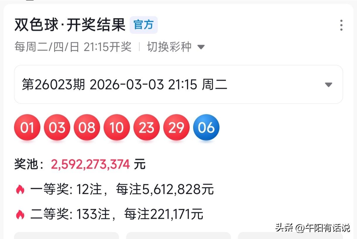 双色球26024期号码共享,红色球关注1、4尾,蓝色球防小号热开 开奖快讯 双色球26023期开奖号码为: 01 03 08 10 23 29 + 06 红色球号码走势 本期红色球三区比为4:0:2,继上期红一区开出断区之后,本期红二区也紧随其后,开出了断区。而红一区号码在连续三期回调冷开之后,出现了强烈反弹,开出了四个奖号,与午阳在本期选号时,所判断方向一致。 前一段时间,红一区号码热度持续走高,三码和四码开出频率明显上升。最近几期,热度逐渐回冷,在上期冷度达到最大值,直接开出了断区。在大冷之后,本期迅速回弹,以大热方式开出,预计接下来以温热状态开出的概率较大。 红三区本期热度有所下降,开出了两个奖号,不过仍然处于温热状态。最近一段时间,红三区号码整体处于回补热开期,虽然期间出现了短暂回调,不过整体热度较高。 尤其是前期和上期连续两期开出了四个奖号,将热度提升到巅峰。不过物极必反,虽然本期仍以温热状态开出,不过接下来出现回调冷开的概率较大。 蓝色球号码走势 本期开奖号码开出了号码06,大号在经过一期短暂回补之后,本期小号再次出现反弹。最近一段时间,小号热度超高,曾连续四期和五期开出。预计接下来小号继续连开的概率较大。 双色球26024期晒号 红色球: 04 06 11 14 15 17 21 26 30 蓝色球: 02 03 08 精选一注 04 11 14 15 21 30 + 08