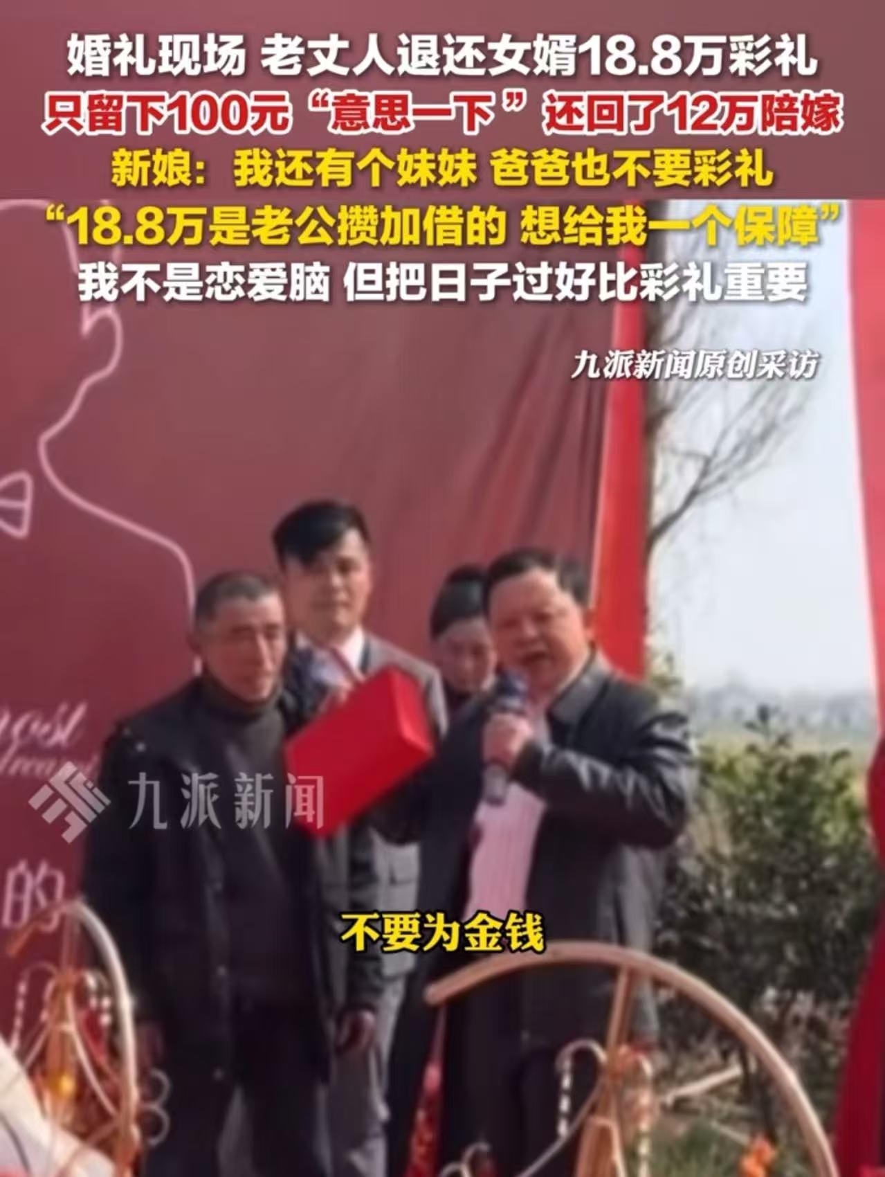 谁能想到,现在结个婚,最圈粉的居然是老丈人。 湖南益阳这场婚礼一出来,全网男生都在问: 这么通情达理的岳父,上哪儿能领? 现在不少人一提结婚就头大, 房子车子 already 压力拉满, 彩礼更是动不动就把人压得喘不过气。 有的家庭为了彩礼吵翻天, 好好一段感情,最后败给一串数字。 但益阳这位新郎,是真的走运。小伙子踏实肯干,家境普通, 为了风风光光娶到心爱的姑娘, 也是拿出全部积蓄,再找亲戚朋友周转, 认认真真凑了18.8万彩礼。 对他来说,这不仅是习俗, 更是自己对这段婚姻最大的诚意。 他当时心里多少也有点忐忑, 毕竟这笔钱,真的来之不易。 结果婚礼当天,名场面直接来了。到了敬茶、递彩礼的环节, 老丈人接过彩礼,操作让人看呆了。 他没多犹豫,就抽了100块钱出来, 剩下的18.79万,当场全退给女婿。 现场不少人当场就看愣了,这也太实在了吧。 你以为这就结束了? 更暖心的还在后面。 老人家反手又拿出12万陪嫁, 直接交给小两口,让他们好好过日子。 一分彩礼没留,反倒倒贴十几万, 这哪是嫁女儿,分明是全力支持小家庭。 在场的亲戚朋友,全都忍不住鼓掌。 很多人看完只有一个感受: 这才是长辈该有的样子。 新娘后来也说,家里还有个妹妹, 爸爸对姐妹俩一向一视同仁, 从谈恋爱开始就说过,不会要彩礼。 他们那一辈吃过苦,更知道钱来之不易, 不想让年轻人刚结婚就背一身压力。 退回的彩礼,一部分用来还之前的借款, 剩下的和陪嫁一起,当成小家庭启动资金。 没有算计,没有内耗,没有矛盾, 两个家庭心往一处想,劲往一处使。 这事一传到网上,直接刷屏。 网友们一边羡慕一边点赞: 羡慕新郎捡到宝,更佩服岳父的格局。 大家夸的不只是退钱这件事, 而是这种不跟风、不攀比、不套路的家风。 现在太多人把婚姻搞得像交易, 彩礼越高越有面子,嫁女儿像“变现”, 最后苦的是年轻人,累的是两个家。 这位老丈人用最简单的方式说清楚: 婚姻不是买卖,是托付,是成全。 留100块,是图个吉利、给个面子; 退十几万,是心疼晚辈、体谅不易; 再贴12万,是给女儿底气、给女婿信任。 人家心里门儿清: 钱没了可以再挣, 孩子的幸福错过了,就真回不来。 比起一时的面子, 小两口和和气气、踏踏实实过日子, 才是最值得的事。 近几年各地都在整治高价彩礼, 提倡移风易俗、婚事简办, 道理大家都懂,但真做到的家庭,格外让人佩服。 有的父母拼命为子女“争取”, 争到最后,把感情争没了,把家庭争累了。 而通透的父母,都在默默“放手”和“支持”。 不坑女婿,不苦女儿, 不为难别人,更不为难自己。 这场婚礼之所以能火遍全网, 就是因为它太治愈、太清醒。 它告诉大家: 好的婚姻,从来不是互相刁难, 而是互相体谅;不是互相算计, 而是互相成就。 彩礼可以有,但要适度; 习俗可以守,但别变味。真正的体面,不是数字有多好看, 而是一家人的心,是不是在一起。 这位湖南老丈人,没有说什么大道理, 却用实实在在的行动, 给很多为人父母、即将结婚的年轻人, 上了一堂温柔又有力量的课。 愿这样的家庭越来越多, 愿每一对真心相爱的人, 都不被彩礼为难,不被现实辜负。 信源: 新湖南 《婚礼现场老丈人退彩礼:18.8万只收100元 》