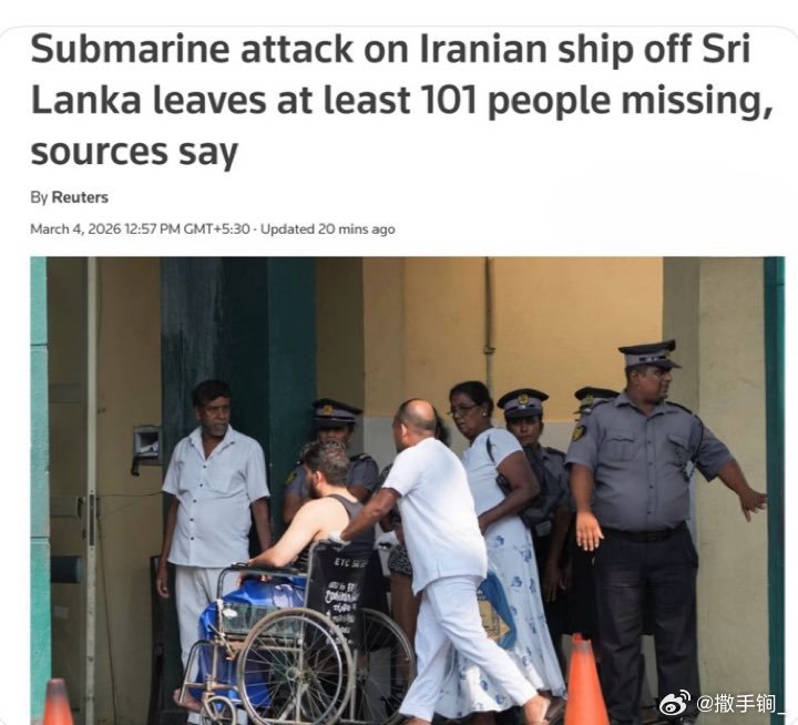 伊朗海军“迪纳”号护卫舰在斯里兰卡以南约40公里海域被击沉。斯里兰卡外交部长赫拉特表示,周三在岛屿领海外沉没的伊朗护卫舰上救起了32名“重伤”水手。受伤水手已被送往斯里兰卡南部的一家医院。这艘拥有180名舰员的护卫舰在黎明时分发出了求救信号。一名官员说:“我们正在继续搜寻,但尚不清楚其他舰员的下落。”这使找到更多幸存者的前景变得阴暗。赫拉斯表示,两艘斯里兰卡海军舰艇和一架飞机已被部署进行救援行动,但未透露导致伊朗军舰沉没的原因。斯里兰卡海军发言人表示,他们的行动符合斯里兰卡的海上义务,32名伊朗水手已被撤离至加勒主医院。发言人说:“我们是在国际义务下响应的,因为这发生在我们在印度洋的搜救区内。”斯里兰卡海军和空军均表示,由于涉及另一国军方,未公开此次救援的录像。这艘护卫舰是参加在印度举行的国际舰队检阅活动,返航途中被击沉。——美国现在是全线作战,没有战区的概念。伊朗又大意了。图一为获救的伊朗舰员被送进斯里兰卡医院;图二为“迪纳”号资料。美国以色列对伊朗发动打击