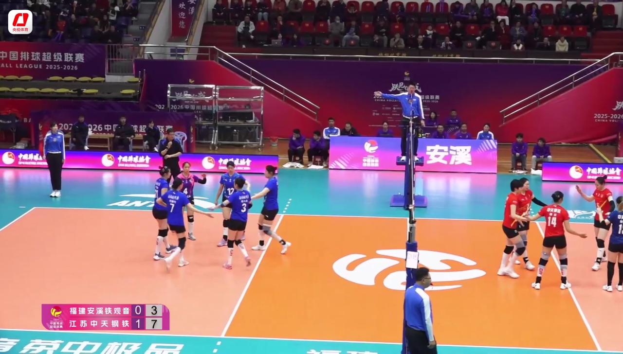 【女排超级联赛】第十七轮:福建——江苏 实时战况: 3月4日晚19:00时,女排超级联赛季后赛第三轮福建——江苏的比赛,在福建主场打响。第—局开始,1平,1:3,江苏领先。2:3,周页彤扣球出界。2:4,吴梦洁。2:5,吴梦洁发球得分。3:5,张馨蕊。3:6,郭中楠快攻。4:6,张馨蕊扣球。4:7,杨佳快攻。4:8,张籽萓发球得分。5:8,福建背飞。5:9,唐欣。5:10,福建暂停。6:12,6:13,6:14,福建扣球出界。6:15,杨佳发球压线。6:16,江苏拦网。福建暂停。7:18,7:19,江苏拦网。7:20,8:20,11:24,12:24,叶佳婧。13:24,14:24,江苏暂停。14:25,江苏胜第一局,大比分1:0,江苏领先! 第二局比赛正在进行中……