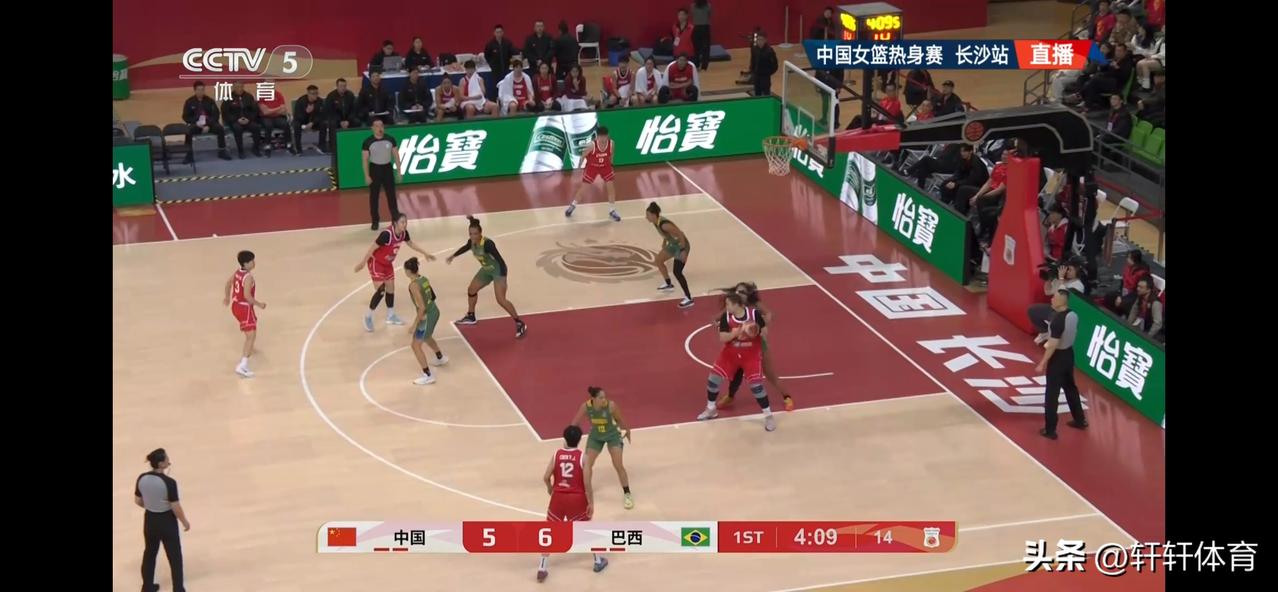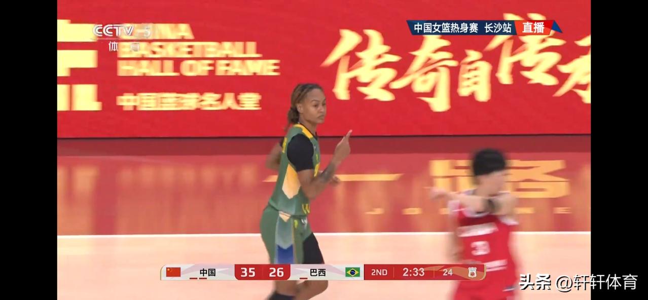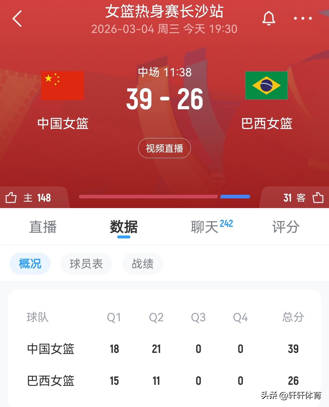 中国女篮热身赛半场结束,中国女篮以39-26领先巴西女篮,首节比赛双方比分交替上升,首节比赛结束中国女篮以18-15领先巴西3分进入第二节,第二节比赛开始后中国女篮逐渐掌握场上主动,单节以21-11半场领先巴西女篮13分,中国女篮场上得分最高的是王思雨的13分,刘禹彤也有10分入账同时还贡献了5个篮板,杨舒予8分3篮板,张子宇4分2篮板,张曼曼,陈玉婕各有两分入账,中国女篮上半场投篮30投15中,投篮命中率50%。