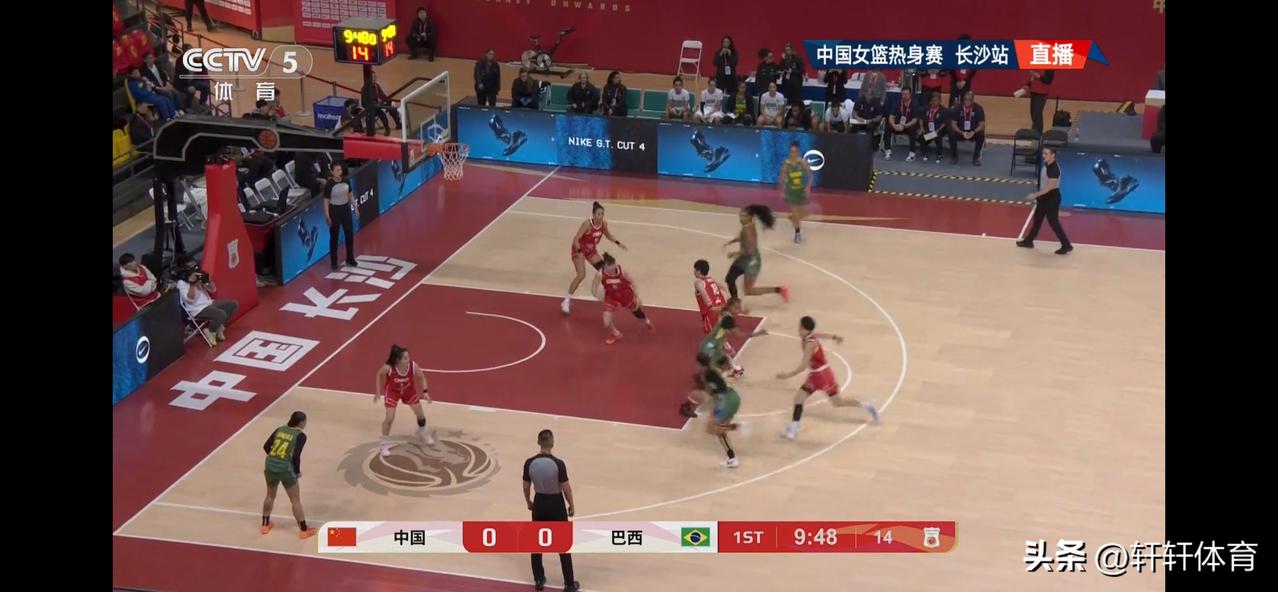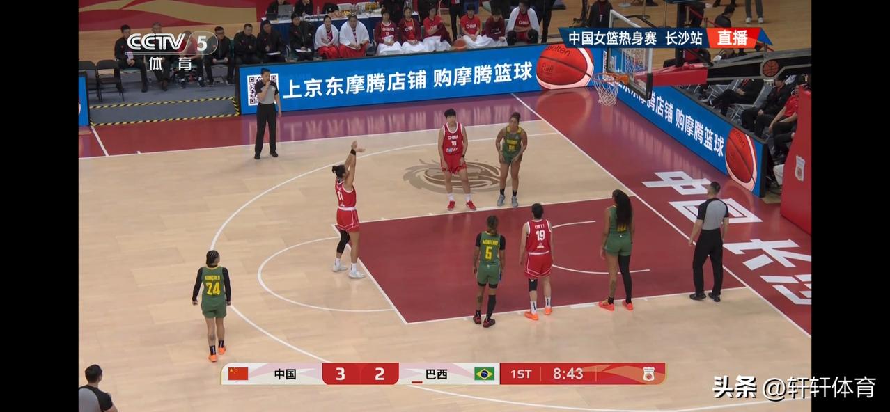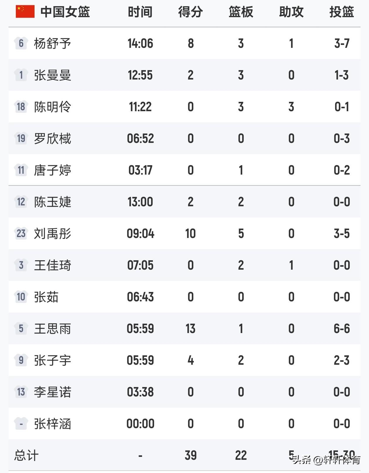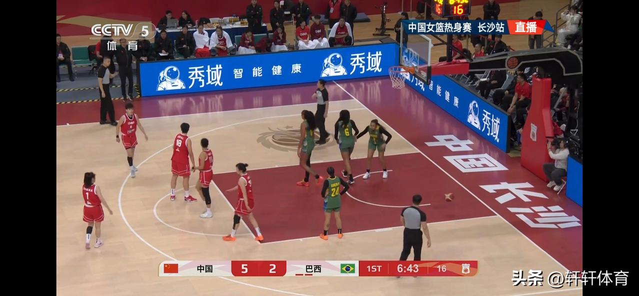 中国女篮热身赛半场结束,中国女篮以39-26领先巴西女篮,首节比赛双方比分交替上升,首节比赛结束中国女篮以18-15领先巴西3分进入第二节,第二节比赛开始后中国女篮逐渐掌握场上主动,单节以21-11半场领先巴西女篮13分,中国女篮场上得分最高的是王思雨的13分,刘禹彤也有10分入账同时还贡献了5个篮板,杨舒予8分3篮板,张子宇4分2篮板,张曼曼,陈玉婕各有两分入账,中国女篮上半场投篮30投15中,投篮命中率50%。