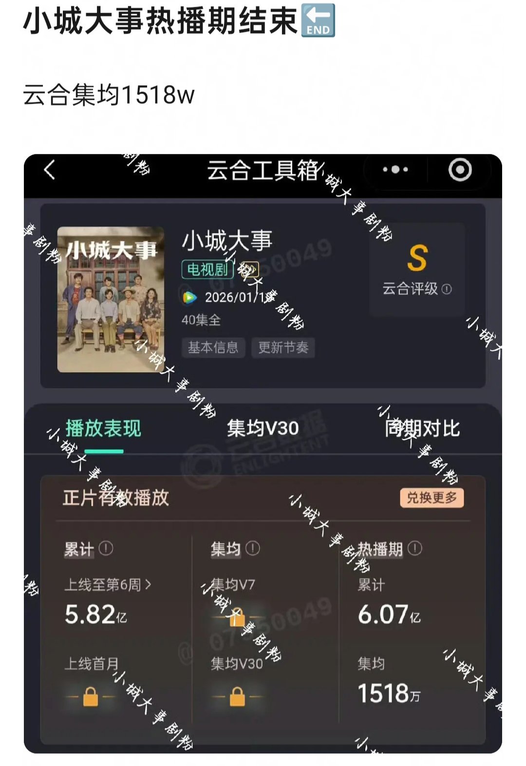 小城大事开播前:超级S➕,开年剧王,峰值破30000➕。热播期结束:云合评级S,