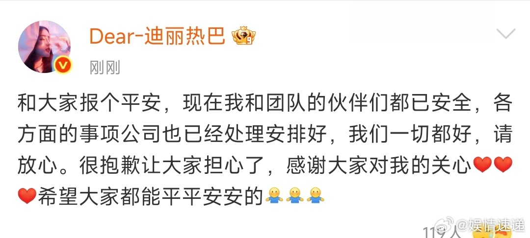 迪丽热巴很抱歉让大家担心了迪丽热巴感谢大家关心嗯嗯