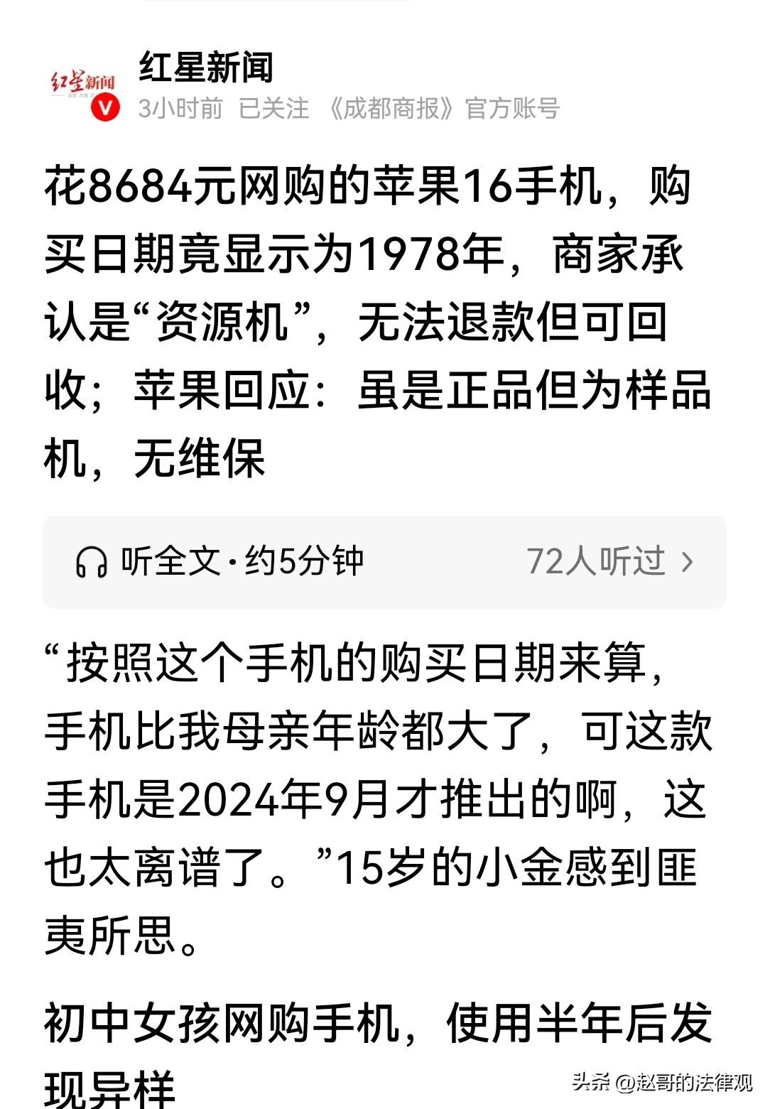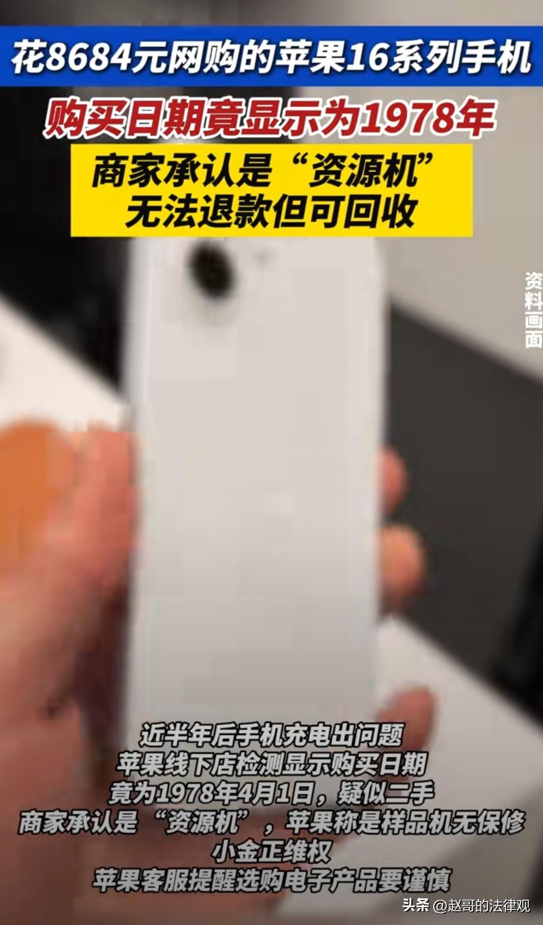 离了个大谱!江苏苏州,15岁初二女孩,花8684块钱买了一部苹果16手机,可仅使用了半年,就无法充电了。拿到品牌门店检测,结果被惊得目瞪口呆:手机激活日期显示是1978年!女孩多次维权后,商家承认是“资源机”,但不给退款。女孩:手机比我妈年龄都大? 初二女孩小金,最近为手机的事,愁的吃不下睡不着的。 2025年9月,她在网上花了8684块钱买了一台iPhone 16 Pro Max。 当时是求了妈妈好长时间才同意的。 谁想到,手机只用了半年不到,手机出毛病了,经常充不进电去。 去苹果门店里一查,才知道这台所谓的“全新正品”,购买日期那一栏,明晃晃写着1978年4月1日。 当时,小金差点被惊掉下巴。 可她买的时候,商家页面写得是“正品保障”“官网可查”,看着特别靠谱,她才就放松了警惕。 等手机寄到家,她打开包装,其实也发现盒子跟平时在店里见的不太一样。 但手机本身看着没问题,她也就没往心里去,直接用了。 结果今年春节那会儿,手机开始闹上了脾气,充电断断续续。 她一开始以为是充电头坏了,换了一个备用的,还是不行。 后来跑去苹果线下的门店,让工作人员帮忙看看。 维修员一查序列号,直接就告诉她,这手机可能是二手的。 工作人员还问她多少钱买的,小金说8684块,人家一听就笑了,说这个价买二手机都贵了。 更离谱的是,系统里显示的激活日期是1978年4月1日。 小金自己都懵了,说这手机是2024年9月才出的新款。 这个日期算下来,比她自己妈妈的岁数都大,这不是闹着玩吗? 今年2月份,小金又去找当时卖手机的商家问情况。 刚开始,商家还挺硬气,反复说保证是正品,官网能查序列号。 但小金追问手机有没有翻新过,对方就开始打马虎眼。 后来逼急了,商家才承认,这手机不是什么全新原装机,是所谓的“资源机”或者叫“库存机”。 而且商家说,这种机子没法退款,但可以回收,意思就是让小金再把手机卖回去。 小金将此事发布到网上后,有媒体记者联系了苹果官方的客服。 客服查了之后,给出了明确的说法,手机确定就是“样品机”。 虽然是苹果生产的正品,但它享受不了官方的任何保修服务。 也就是说,这手机要是再出啥毛病,不管是花钱修还是免费修,苹果的直营店和授权店都不管。 为啥2024年才出的手机,会显示1978年的购买日期? 可把小金纳闷坏了! 苹果客服解释,这是他们特意做的标记,就是为了把全新机和样品机区分开。 因为苹果有规定,官方渠道只能卖全新的机器,为了不让这些样品机浑水摸鱼,就把它们的购买日期统一设成1978年4月1日,一看这个日期就知道不是新机。 其实这种“资源机”在行里也不是啥秘密。 有懂行的人说,这也叫“富士康机”或者“BS机”。 来源大多是苹果官方渠道退回来的,7天无理由退货。 这些手机有的就拆了个封,有的甚至没拆封,但按照苹果的政策,它们不能再当新机卖,就只能打包处理给别的渠道流到市面上。 这种手机价格确实便宜,比如有的型号能比官网便宜3000多。 但麻烦就麻烦在,货源乱七八糟,有些不良商家会把翻新机、修过的机子混入。 在打着“资源机”的名头往外卖。 这种机子在苹果官网也能查到序列号,但就是没保修,消费者一旦买着有毛病的,就只能自己认栽。 小金后来才发现,商家的商品详情里其实写了“资源机”几个字,但她当时根本没注意,也不懂这是啥意思。 目前,小金一个学生,不知道该怎么办了。 有人说,手机价格明显低得离谱,就要多个心眼。 收货后马上去官网查序列号,别嫌麻烦,不然真出了事,吃亏的还是自己。 《民法典》第十九条:八周岁以上的未成年人为限制民事行为能力人,实施民事法律行为由其法定代理人代理或者经其法定代理人同意、追认。 15岁的小金,属于限制民事行为能力人。 8684元的手机价格较高,明显超出了15岁未成年人通常所能理解的消费范围。 其购买手机的行为,需要法定代理人同意或追认才有效。 若小金购买手机,未经家长事先同意,事后家长也未对该购买行为进行追认。 那么小金与商家之间的买卖合同是无效的。 商家应当退还货款,小金将手机返还给商家。 同时,商家以“资源机”冒充全新原装机销售,存在欺诈嫌疑。 违反了诚实信用原则,小金可要求商家承担相应责任。 有人说,既然商家承认是“资源机”,却无法退款,只能回收处理,这是给苹果抹黑。 对此你怎么看? 关注@赵哥的法律观,欢迎评论区发表您的看法。