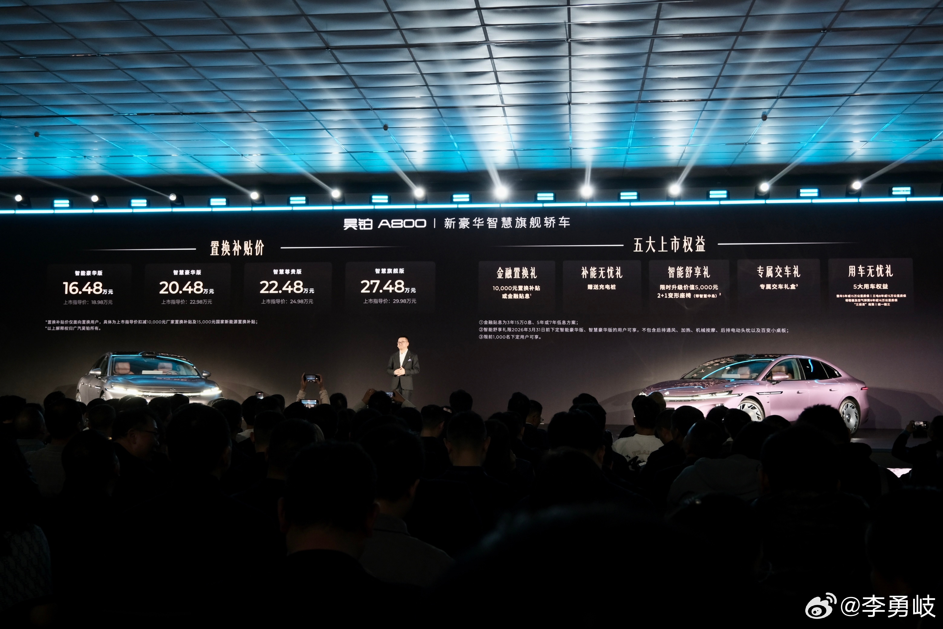 搭载华为最新896线激光雷达,起步即是百万级配置!昊铂A800正式上市,限时16.48万起新豪华旗舰昊铂A800上市补贴后16.48万起3月4日晚,昊铂旗下中大型轿车-昊铂A800正式上市,共推出4款车型,售价区间为18.98-29.98万元,限时置换补贴价16.48-27.48万元。另外,订车可享5大权益。新车定位为新豪华智慧旗舰轿车,搭载华为乾崑智驾ADS V4.1和鸿蒙座舱HarmonySpace 5等配置。并且可选尊界S800、问界 M9“同款”华为乾崑智驾全球量产最高896线激光雷达方案。有意思的是鸿蒙智行刚刚在下午举行了技术焕新发布会,而昊铂A800前期预热的时候就是以华为乾崑智驾+鸿蒙座舱为卖点,昊铂A800选择在华为鸿蒙智行发布会同一天登场,或许就是要把“含华量”打足了!动力方面,新车搭载由1.5T发动机组成的增程系统,其中增程器最大功率为160马力,电机根据配置不同提供272马力(后置单电机)和598马力(三电机)。电池方面,该车全系配备由苏州正力提供的磷酸铁锂电池组,容量为35.03kWh,对应WLTC纯电续航里程为178公里和163公里。虽说昊铂A800真的是一台相当称职的中大型车,豪华感和舒适性定位一点也不含糊,还有华为最强双智,但中大型车的赛道可是非常拥挤,以往是BBA把这个门守死了,现在则有了更多中国品牌选手靠更强的科技感和配置来抢蛋糕,这里边表现比较抢眼的有比亚迪汉L和岚图追光L,它们也是昊铂A800的对手。大家觉得昊铂A800有戏吗?