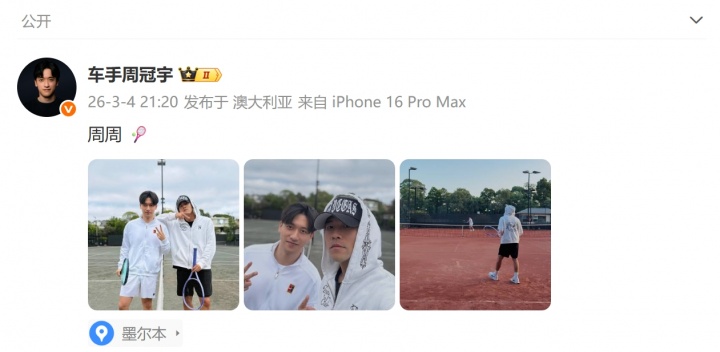 直播吧03月04日讯今日车手周冠宇更新社媒,晒出了与歌手周杰伦打网球的合照以及自拍,发布定位墨尔本。