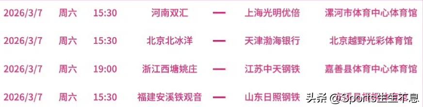 2025~2026中国女子排球超级联赛季后赛第三轮战报: 3月3日 A组 1️⃣(天津市人民体育馆) 天津渤海银行3-1河南双汇(图1) (24-26/25-15/25-18/25-20) 2️⃣(北京越野光彩体育馆) 北京北冰洋1-3上海光明优倍(图2) (25-19/29-31/17-25/28-30) A组即时排名: 1️⃣上海光明优倍 3/0 9 +8 2️⃣天津渤海银行 1/2 4 -2 3️⃣北京北冰洋 1/2 3 -2 4️⃣河南双汇 1/2 2 -4 —————— 3月4日 B组 1️⃣(安溪县梧桐体育馆) 福建安溪铁观音0-3江苏中天钢铁 (14-25/17-25/19-25) 2️⃣(日照香河体育公园体育馆) 山东日照钢铁3-0浙江西塘姚庄 (25-7/25-12/25-18) B组即时排名 1️⃣江苏中天钢铁 3/0 9 +9 2️⃣山东日照钢铁 2/1 6 +3 3️⃣福建安溪铁观音 1/2 3 -4 4️⃣浙江西塘姚庄 0/3 0 -8 —————— ⭐主客场双循环赛制,小组前两名晋级四强。 ⭐季后赛第四轮的四场比赛将在3月7日进行(图3)。