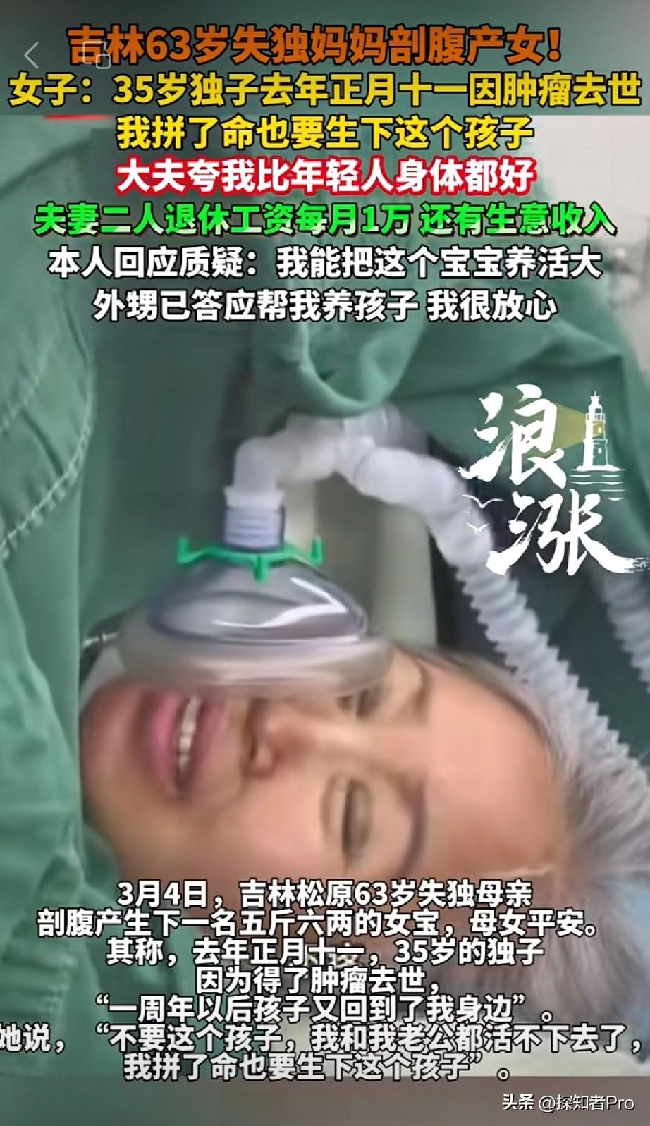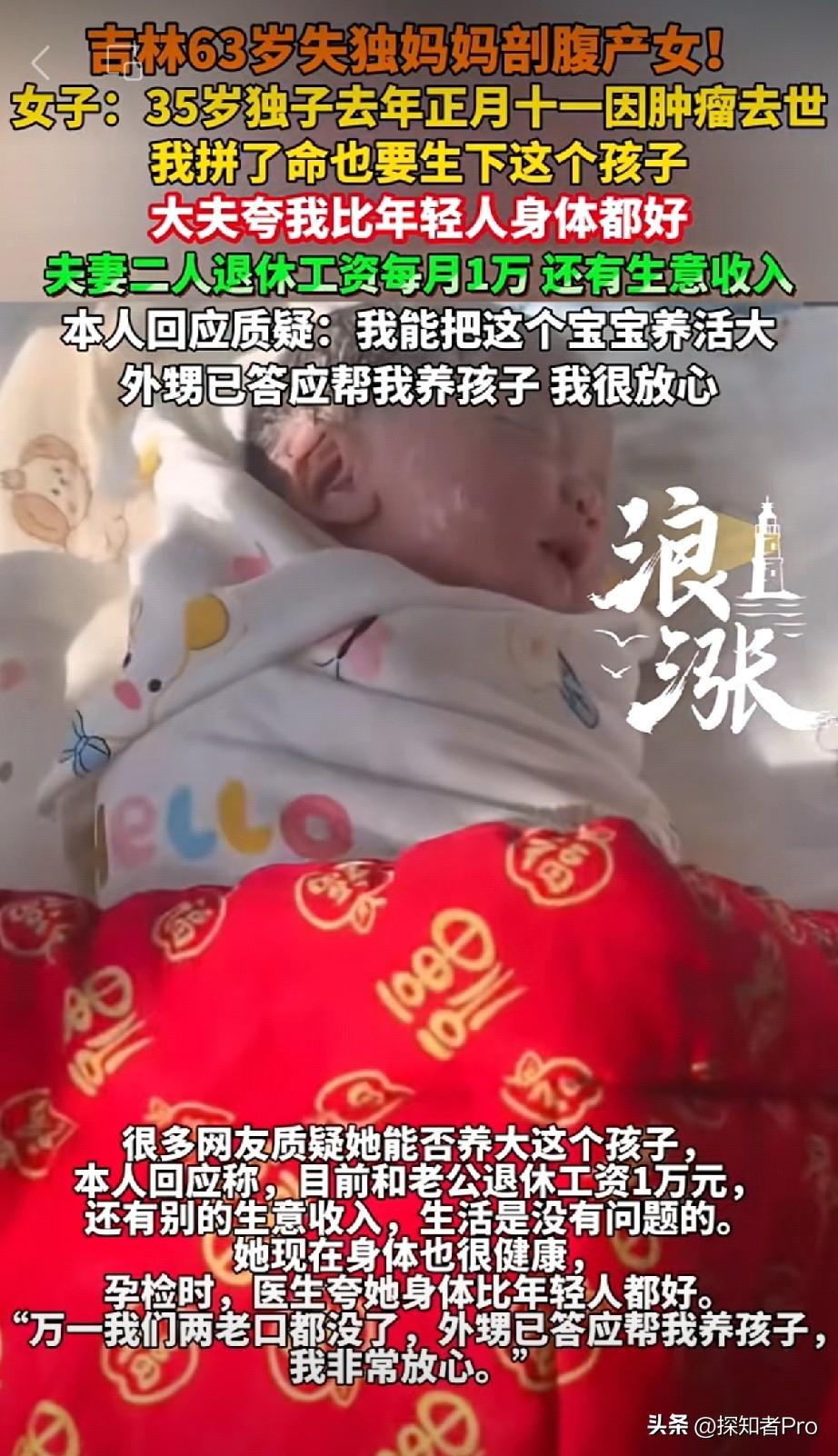 63岁女人生孩子会是啥感觉? 吉林63岁老大姐,用亲身经历说:没啥感觉,孩子就出来了!😱 母爱如海深、如山重,这位大姐63岁高龄,已是苍苍,却冒着生命危险的压力,不顾所有人的反对,坚决十月怀胎,生下孩子,真的很勇敢、很伟大。 好在,老大姐身体很健康,连医生👩🏻⚕️都说她的身体比很多年轻人都要健康,所以生产也很顺利,生下了5.6斤重的女儿,母女平安。 💔之所以63岁高龄还坚决拼命要生孩子,这背后有着令人泪目的故事—— 1年前,35岁优秀儿子因肿瘤离世,白发人送黑发人,儿子也没有结婚生子,留下两老孤独伤心... 大姐说,不会担心养孩子的问题,她和老公退休工资一万多,还做点小生意,能养活女儿。 而且今年刚结婚的外甥也答应,万一老两口某天有什么意外,外甥会当亲生女儿抚养。 要不说,生命真是神奇,63岁重新当妈,白发人送黑发人后,又迎来新生命... 为老大姐的勇敢点赞👍 也祝福老大姐和她的“小公主”老少平安、身体健康! (来源:青岛新闻网、极目新闻权威报道)