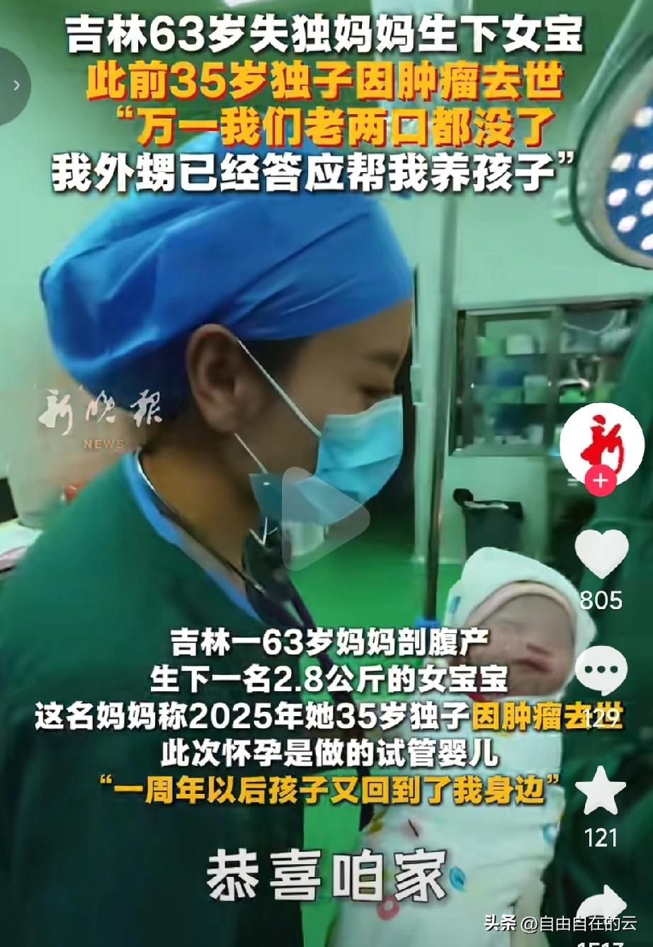 吉林63岁女子再当妈妈,今天生下一个女儿。有网友说,63岁生孩子,这是对孩子的不负责,等孩子上小学,她们就70多岁了,孩子刚成年,他们就80多了。万一有个头疼脑热的,孩子就得伺候,这个孩子压力太大了。 如果是别人,这个年纪还要孩子,我也和上面的网友一样的态度。可是阿姨是失独家庭,她唯一的儿子去年去世了。儿子也没留下孩子。阿姨说老两口如果没有这个孩子,可能都没法活下去。 说实话,这不是阿姨夸张。我曾经见过一个失独的母亲,失去唯一的孩子后,每日以泪洗面,也不出门见人,天天躲在自己孩子屋里,最后得了重度抑郁症。 况且对于养孩子,阿姨有经济实力,他们夫妻都退休了,还有自己的生意,收入可观。再说他们身体也都挺好的,家里老人也都很长寿,他们觉得陪女儿几十年没问题。 即使出现意外,阿姨也做了准备,说外甥会帮她养女儿。 我觉得这样的父母,除了年纪大点,比年轻不负责任的父母还好,我们 就祝福这个妈妈吧,希望她养好身体,陪伴女儿一起成长。