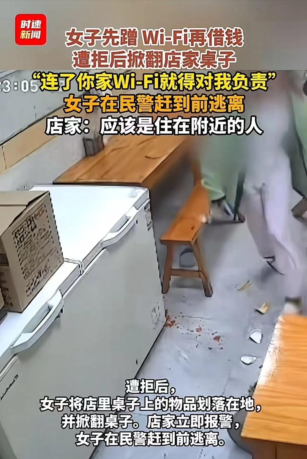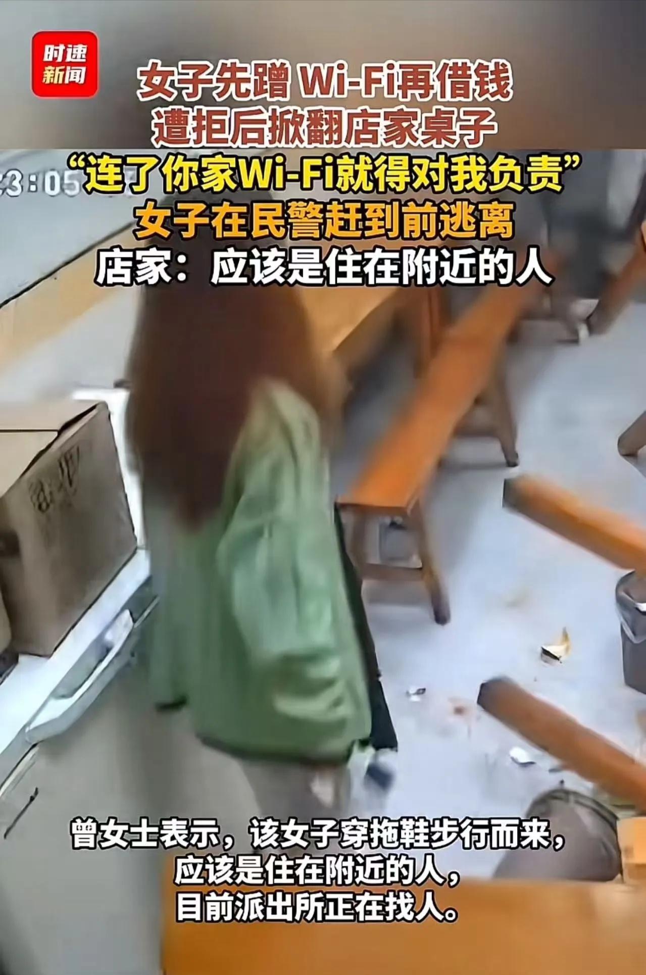 “我连了你家WiFi就得对我负责!”江西女子蹭网借钱被拒,掀桌后扬长而去 江西赣州的曾女士怎么也没想到,自己好心给人行个方便,最后竟招来这么一场无妄之灾。 那天中午,曾女士正在店里忙活着,一个穿着旧拖鞋的陌生女人晃晃悠悠走进来。她没点菜,也没找座儿,站在门口就直接问:“老板,你家WiFi密码多少?”曾女士心想这也不是什么大事,顺手就把密码告诉了她。 这女人也不客气,往门口的小板凳上一蹲,掏出手机就开始刷视频。抖音刷完刷快手,快手刷完打游戏,一蹲就是二十多分钟。全程既没点过一瓶水,也没说过一个谢字,蹲累了换个姿势继续蹲,完全把人家店门口当成了自家客厅。 曾女士虽然心里有点不得劲儿,但想着都是街坊邻居的,也不至于为这点事儿计较。可她万万没想到,真正的“好戏”还在后头。 这女人玩够了,总算收起手机站了起来。曾女士本以为她要走了,结果人家径直走到收银台前,冲着曾女士伸出手:“老板,借我100块钱。” 曾女士一愣,心说咱俩认识吗?便问道:“妹子,我好像没见过你吧?” 那女人一脸无所谓:“我手机里没钱了,你借我100块应急,回头还你。” 曾女士心里直犯嘀咕——这年头谁还没个亲戚朋友?真没钱了,打个电话让家里人转个账不就完了?干嘛跟一个陌生人借钱?再说了,我跟你非亲非故的,凭啥借给你?于是曾女士委婉地拒绝了:“不好意思啊妹子,不方便借。” 这话一出,刚才还笑嘻嘻的女人,脸色瞬间就变了。 “不借?你什么意思?”她声音陡然拔高,“我在你这儿连了这么久的WiFi,给你捧场了,你现在不借?” 曾女士都被气笑了:“我免费给你连WiFi,跟借钱是两码事啊!” “我不管!”那女人突然像被踩了尾巴的猫,猛地冲上前,双手抓住桌角,扯着嗓子吼了一句:“我连了你家WiFi,你就得对我负责!” 话音未落,她猛一用力,整张桌子直接被掀翻在地!桌上的东西哗啦啦砸了一地,曾女士吓得往后退了好几步。 等回过神来,曾女士又惊又怒,指着那女人喊:“你凭什么砸我的店?我要报警!” 那女人倒像个没事人似的,双手叉腰站在那儿,嘴里还在不干不净地嚷嚷。曾女士颤抖着手拨通了110,可那女人趁着民警还没赶到,脚底抹油就往外溜。曾女士的丈夫追出去一百多米,愣是没追上这穿拖鞋的女人。 事后曾女士跟民警描述,那女人穿着双旧拖鞋,看着就住在附近。目前派出所正在全力排查,找到她应该只是时间问题。 这事儿在网上传开后,网友们都看傻了:“这是什么神仙逻辑?连个网就得负责养你?”“蹭个网就敢要钱,以后借个充电宝是不是就敢要房子?”“这已经不是道德问题了,这是违法犯罪!” 有律师指出,这女人掀桌子砸东西,已经触犯了《治安管理处罚法》,故意损毁公私财物,轻则拘留罚款,重则可能涉嫌故意毁坏财物罪。再加上她强拿硬要、寻衅滋事,这顿拘留是跑不了了。 说到底,曾女士好心分享个WiFi密码,换来这么一场闹剧,实在让人寒心。如果这种逻辑横行,以后谁还敢做好事?善良不是软柿子,法律也不是摆设。希望警方早日找到这女人,该赔偿赔偿,该拘留拘留,给曾女士一个交代,也给所有不讲理的人上一课。
