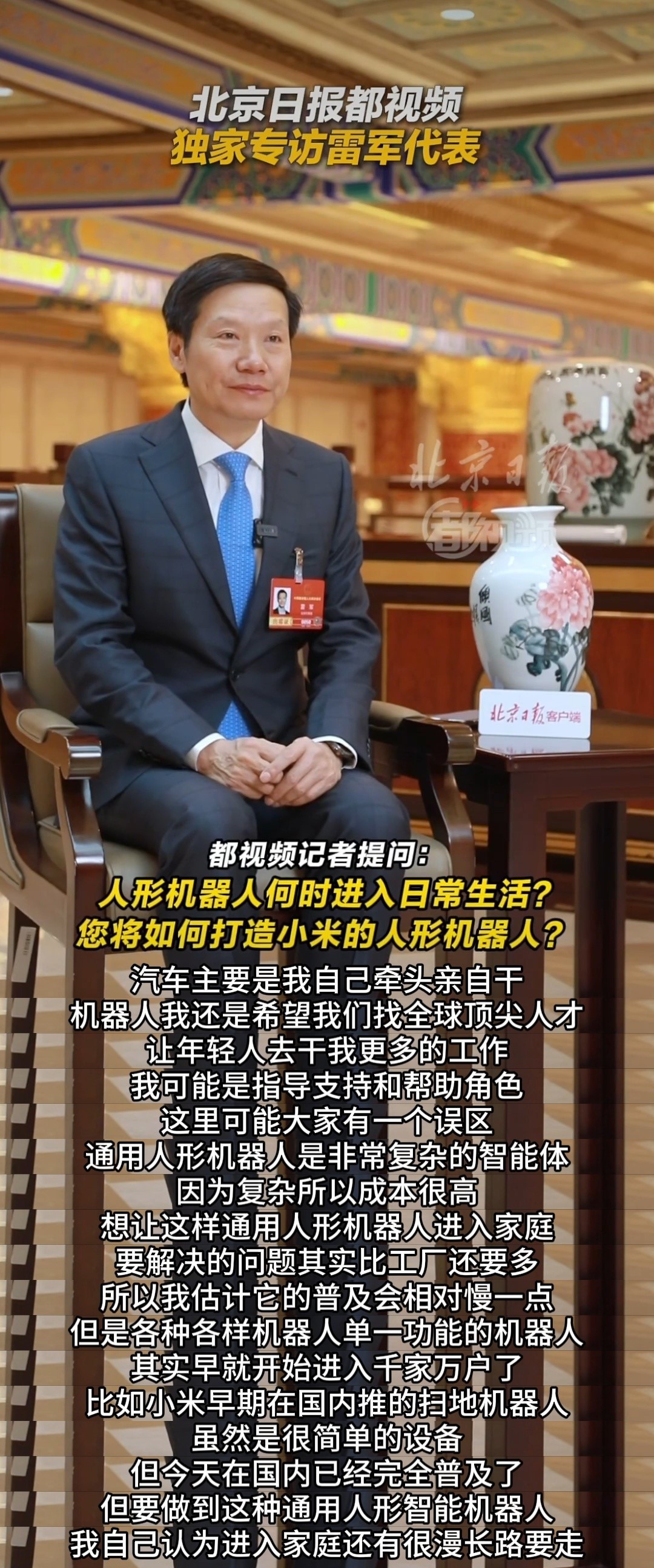 雷军两会专访全程都在聊机器人看完这次专访我真是愣了,一个小时里雷总几乎没跑题,完全把话题锁死在机器人上。这种专注度,说实话比发布会还“业务猛”。再加上前两天机器人工厂的视频、两会提案一起看,就能明显感觉到:小米这次不是跟风做机器人,而是当成核心工程在推。