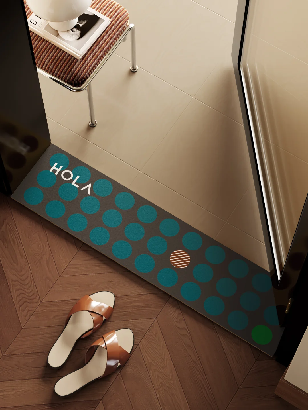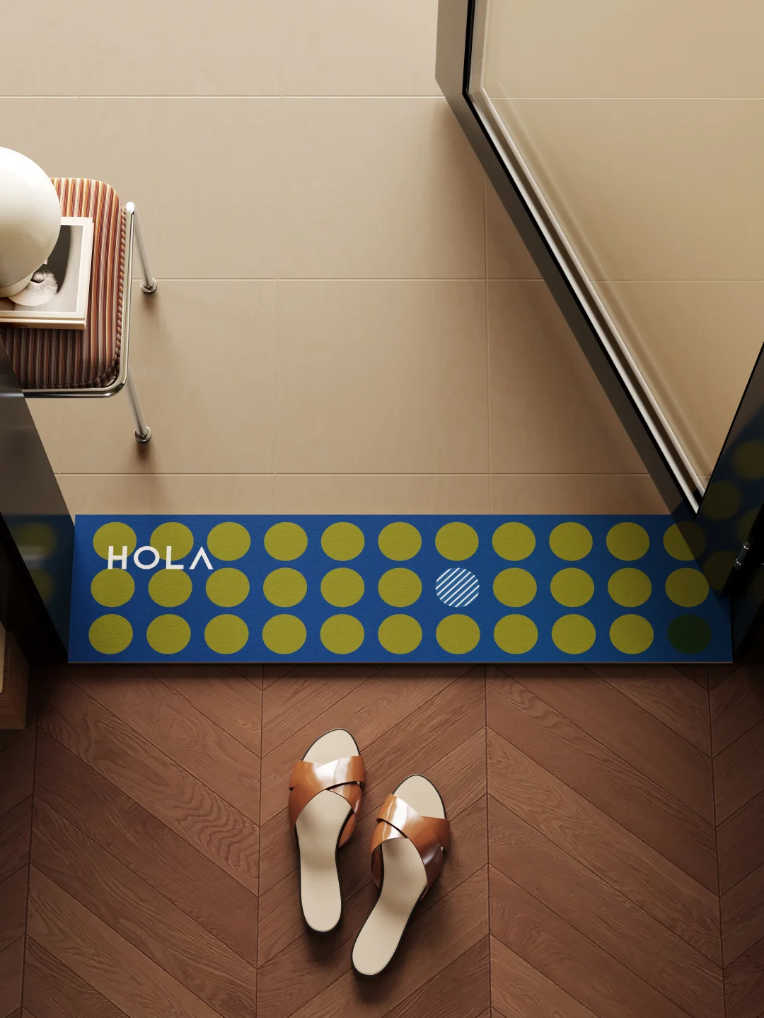 克莱因蓝的底色上,牛油果绿的波点像音符一样跳跃🎵 还有一颗藏着条纹的 “特别嘉宾”,像在跳一支复古圆舞曲💃 “HOLA” 的问候,让每次回家都像在迎接一场小派对🥳 🔵 蓝绿撞色,复古又时髦,随便一拍都是 ins 风大片 🟢 波点元素,活泼又治愈,瞬间点亮沉闷的入户角落 🎶 圆舞曲般的韵律感,踩上去都觉得脚步变轻盈了
