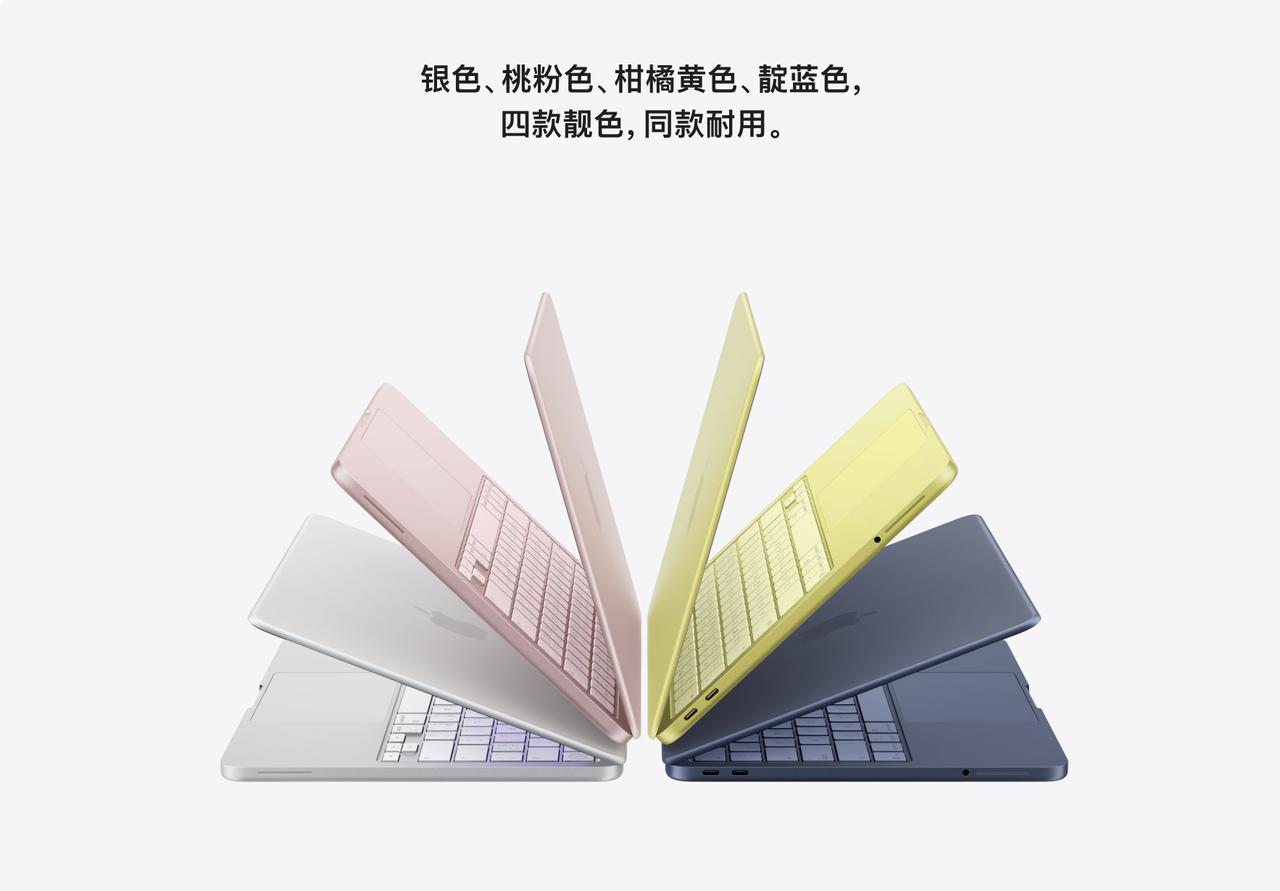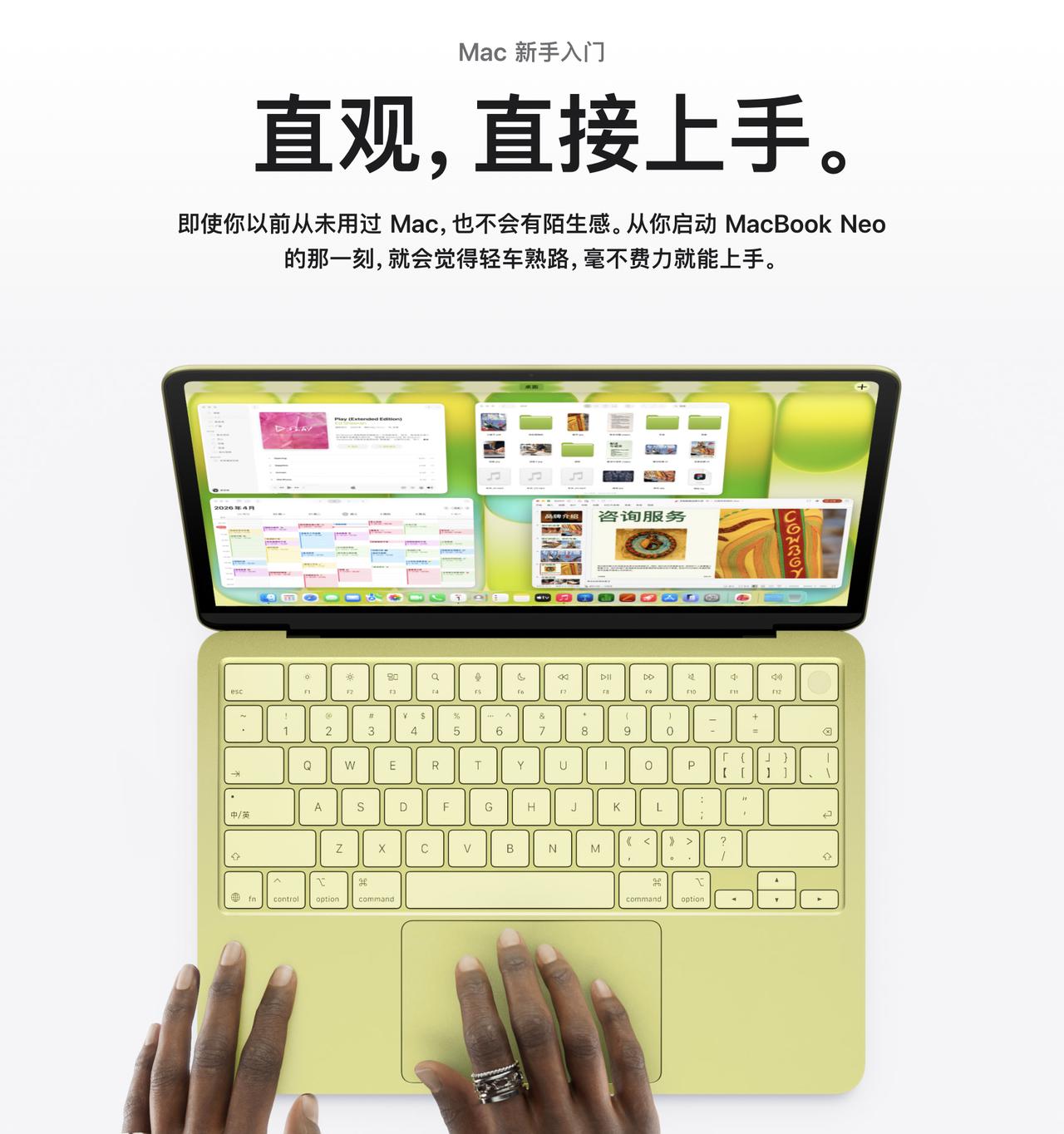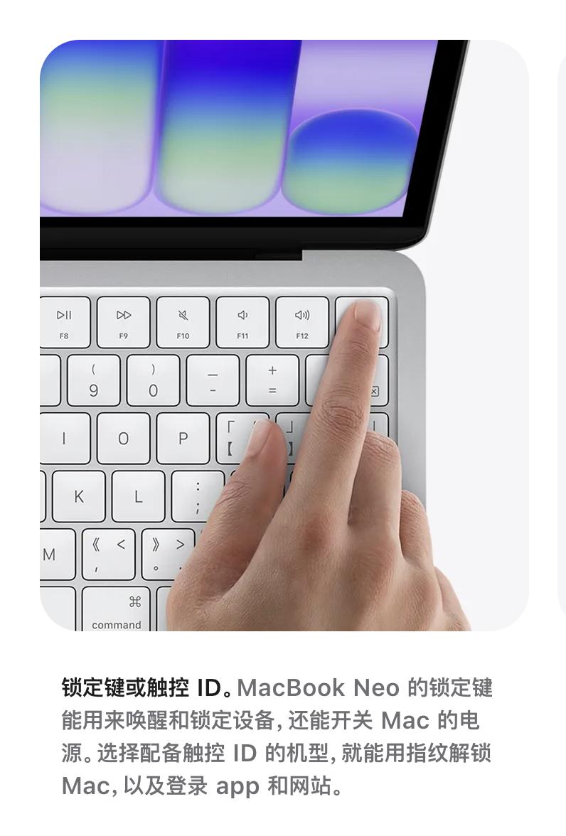 MacBook Neo 详细资料:8+256GB 售价 4599 元、8+512GB 售价 5299 元,256GB 版本无 Touch ID,3 月 6 日上午 9 点接受预购,3 月 11 日发售。 - 芯片:A18 Pro 处理器(5 核 GPU 版),比 iPhone 16 Pro 少一颗 GPU 核心,采用台积电第二代 3nm 技术,6 核 CPU,其中 2 个性能核心和 4 个效率核心,16 核神经网络引擎,60GB/s 内存带宽; - 屏幕:13 英寸 2408×1506 LCD 屏幕(IPS),屏幕最高亮度 500nits,支持 10 亿色 - 相机:1080p FaceTime 高清摄像头; - 续航:36.5 瓦时电池,配备 20W 充电头,最长 16 小时的流媒体视频播放; - 其他:银色、桃粉色、柑橘黄色、靛蓝色 4 款配色,厚 1.27cm,重 1.23kg,支持 Wi-Fi 6E 、蓝牙 6.0,USB 3 接口(10Gb/s)×1、USB 2 接口(480Mb/s)、3.5 毫米耳机插孔 ×1,不支持 MagSafe,双扬声器,已为 Apple 智能预备好。