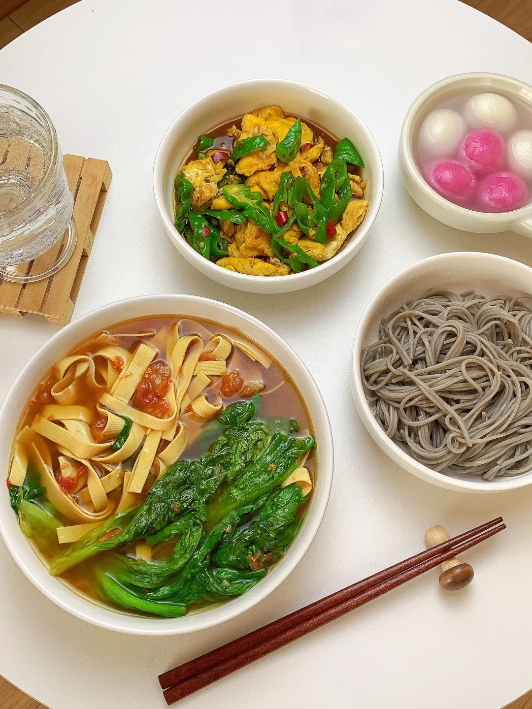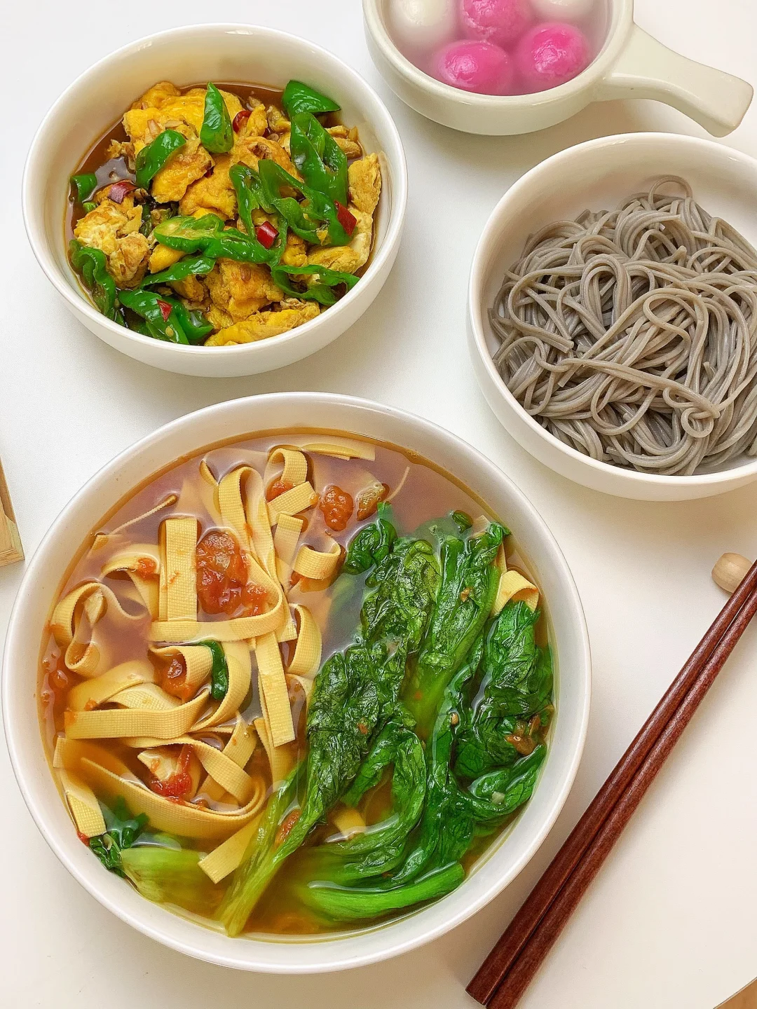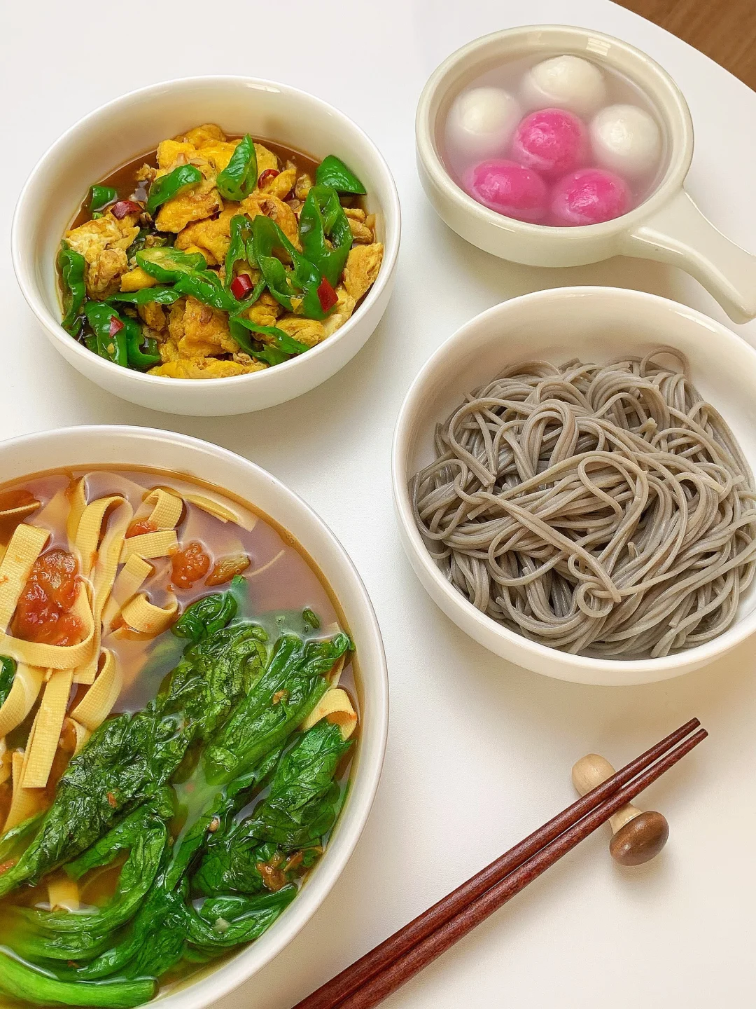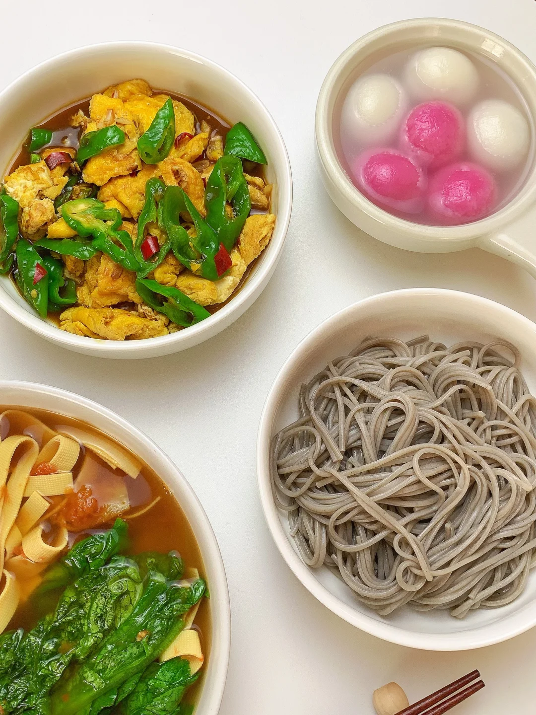 👩🏻🍳分享今日菜单(后附图文做法~) 番茄🍅豆皮生菜汤 青椒🫑炒鸡蛋 主食:荞麦面条 ~今天有元宵哦 ……………………………………………………………………………… 🛒食材清单: 鸡蛋 | 青椒🫑 | 生菜 | 豆皮 | 番茄炒蛋 | 荞麦面条 📝我的美食日记,一日三餐,拒绝外卖[偷笑R],坚持做饭的每一天,吃简单干净的饭菜~ ₍˄·͈༝·͈˄*₎◞ ̑̑ ✨✨好好吃饭,生活化减脂~