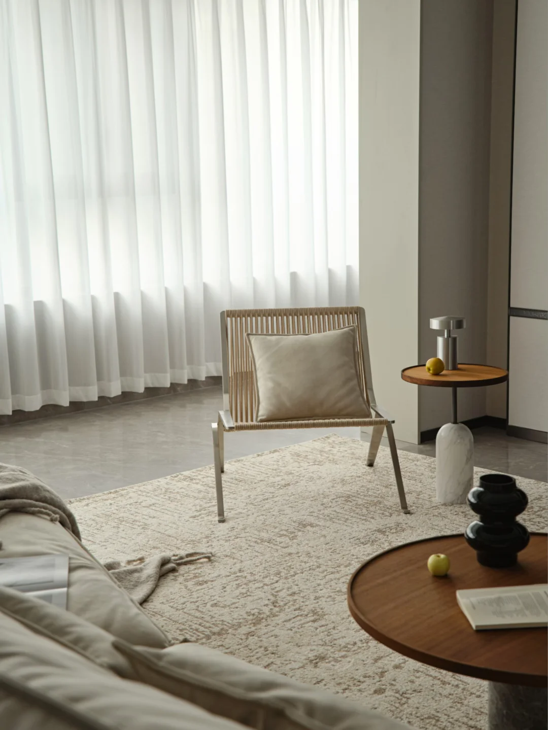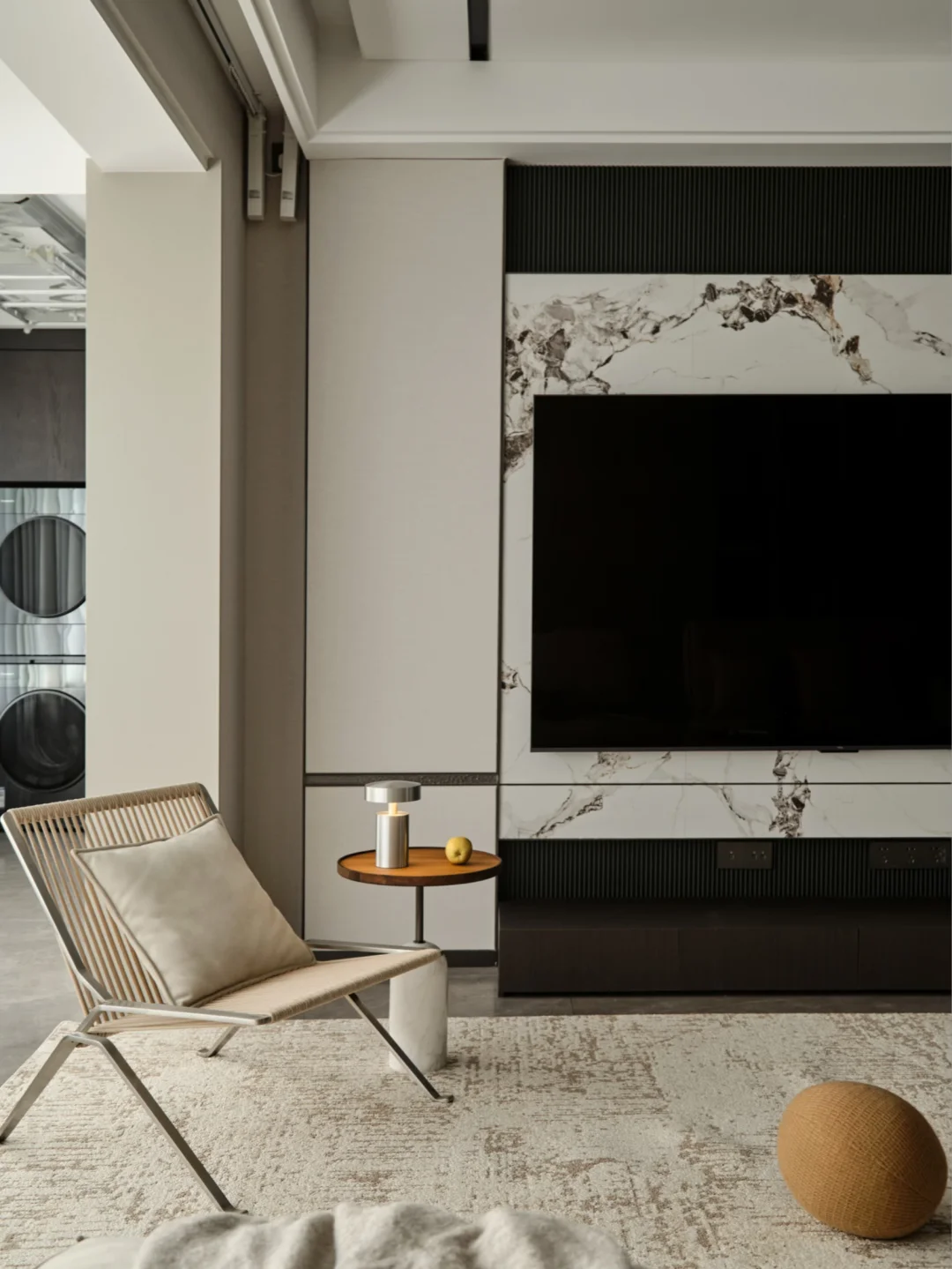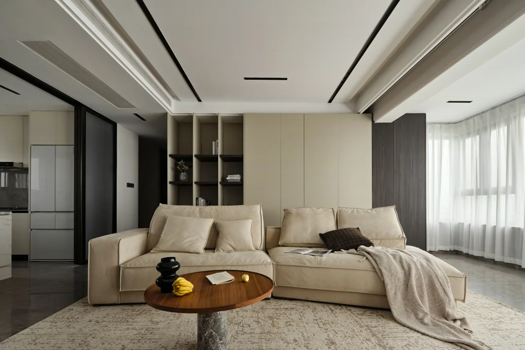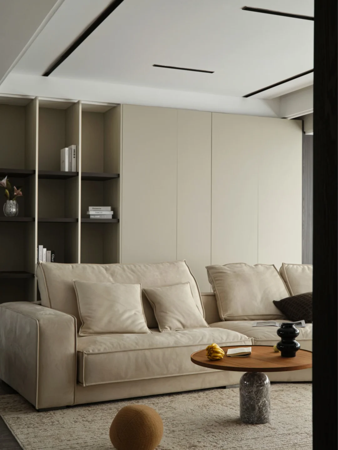 深业南湾精装改造客厅案例分享🔚 客厅改造拆除阳台移门,将空间纳入客厅,瞬间拉阔视野保留原有地砖,仅做收边过渡,让阳光无阻倾洒 拆除沙发背后进深不足的展示柜,换为“展示+封闭收纳”组合柜 色彩材质沿用原风格,整体和谐又美观 -