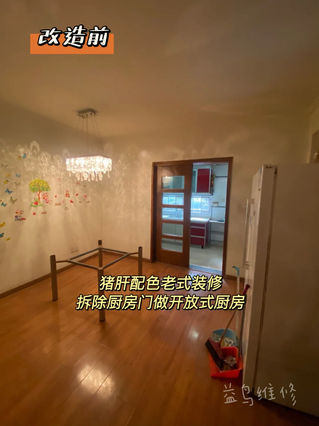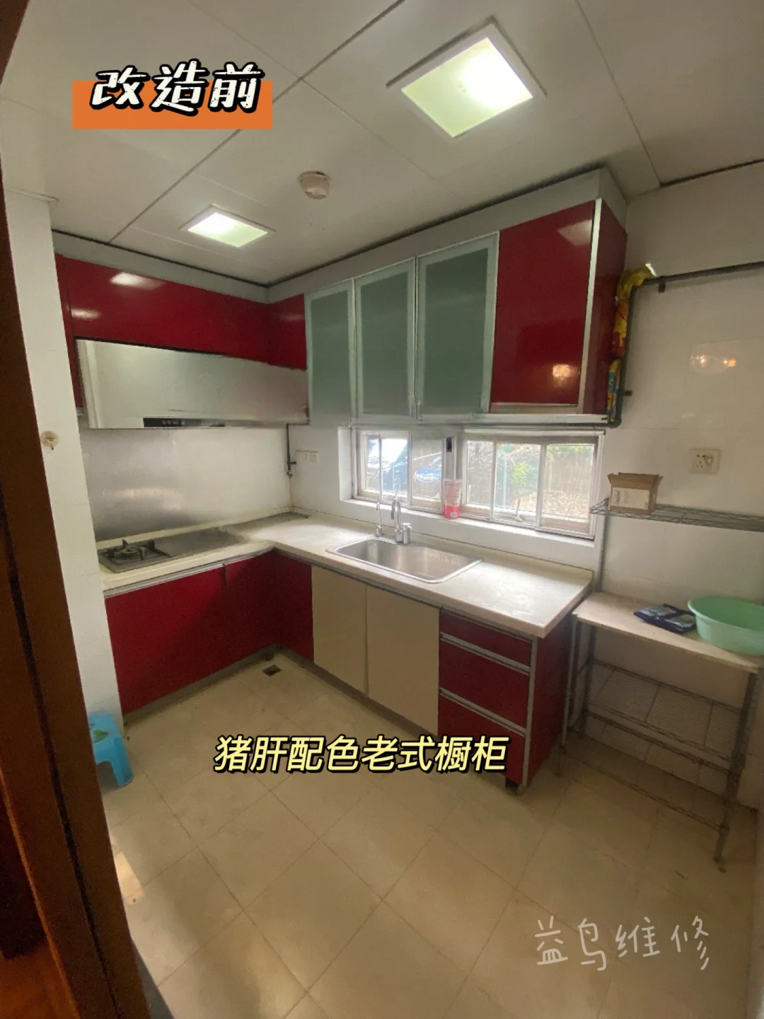 墙面掉皮发黄,整个屋子雾蒙蒙的,显得特别邋遢;光线昏暗压抑,白天都要开灯;厨房更是重灾区,猪肝黄、猪肝红配色,土气又过时,做饭都没心情
