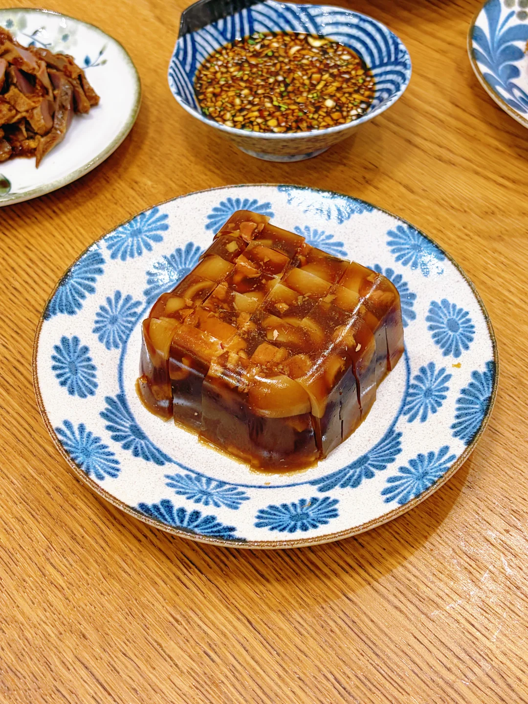过了十五,这年就算过完了,汤圆留在晚餐,午餐吃的手擀面、豆角肉丝汆儿、卤好的猪口条和鸭胗切片、肉皮冻。 猪口条即猪舌头,以前都得到肉铺预定才成,现在在超市就能买到,还特别新鲜;用电饭煲把口条和鸭胗同卤,浓香不腥,凉后切片太开胃。 平时炒菜切下来的肉皮攒几片,用电饭煲煮好放冰箱冷藏,比买的还好吃。