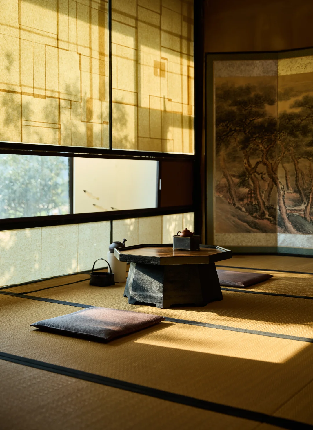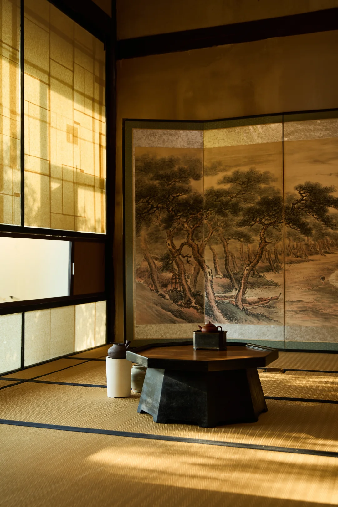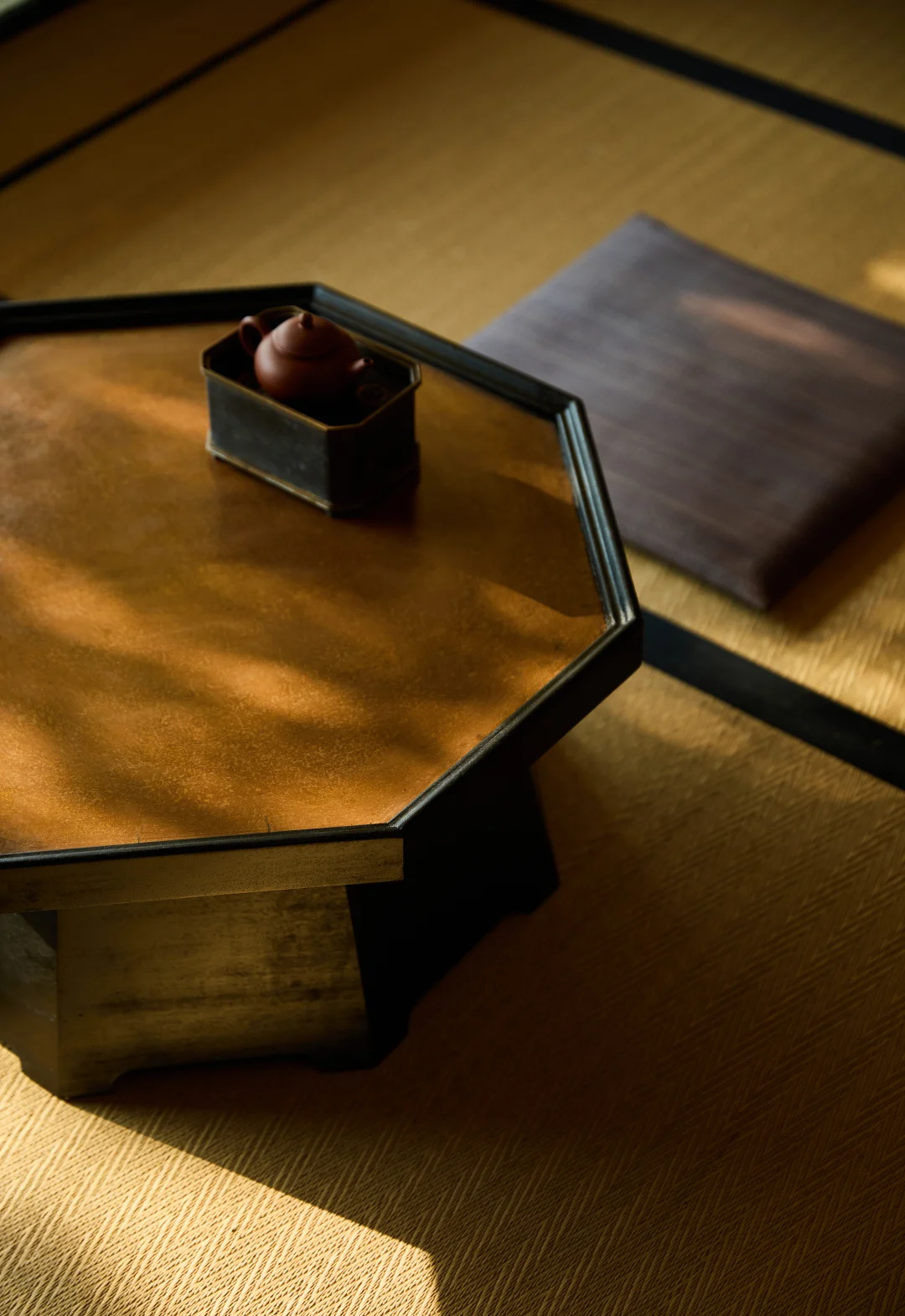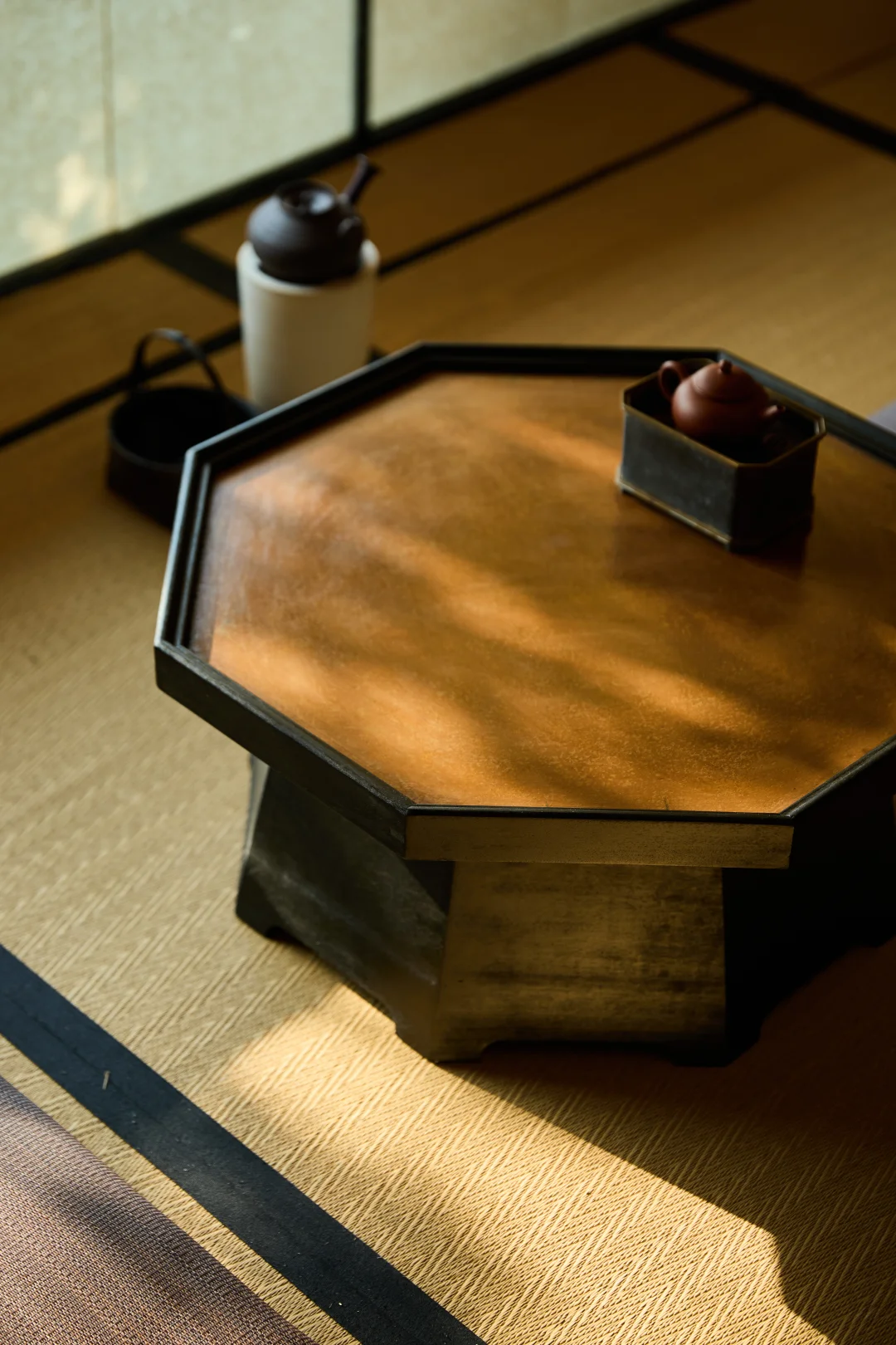 八角为骨,勾勒天地方圆。 采用非洲加蓬的核桃木材质, 榫卯结构,20年以上专业的老师傅手工制作。 桌面为大漆洒金色,非常复古高级。 . 茶汤倾下,水汽氤氲。 喧嚣止于桌沿,心安于这一方。 . 一器,一境,一人饮。 . 新中式家具 东方茶事 核桃木 高级感家居