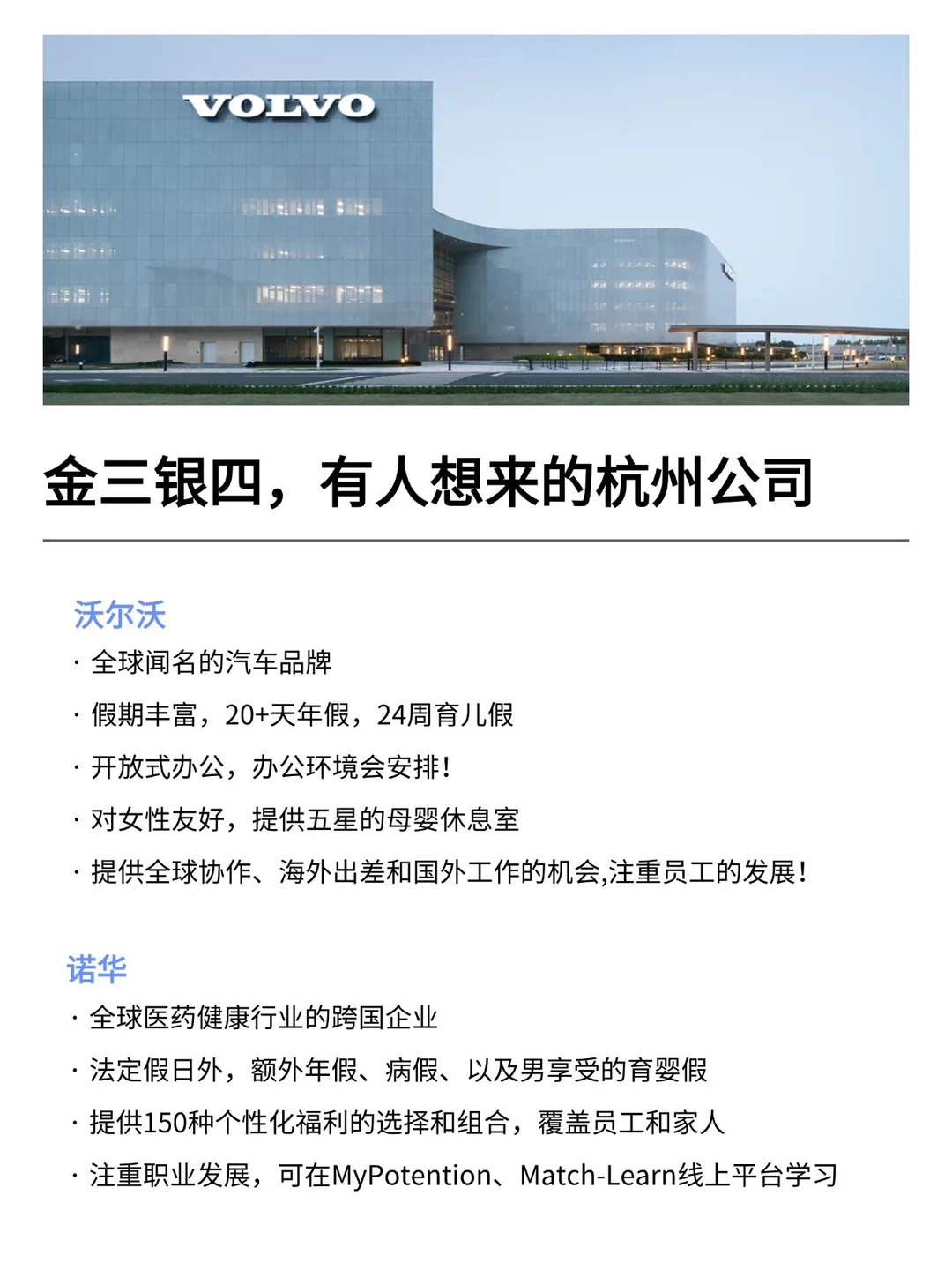 杭州发展真的越来越好,有不少小而美、冷门宝藏的公司,金三银四是真的很多的机会! 特别是有不少小众冷门的外企,真心建议大家可以去试试 · 大家不要觉得外企很难进 其实外企也有一些常规类、英语要求没有那么高的岗位 · 为什么还是值得去外企? ▪️氛围好,对女性友好,年假长,平均年假都是15天 ▪️还支持居家办公、福利完善,是真的能实现WLB ▪️待遇也还不错,年后找工作的真的可以考虑考虑~ · 坚持日更,帮大家在找工作路上顺利拿 offer! ·