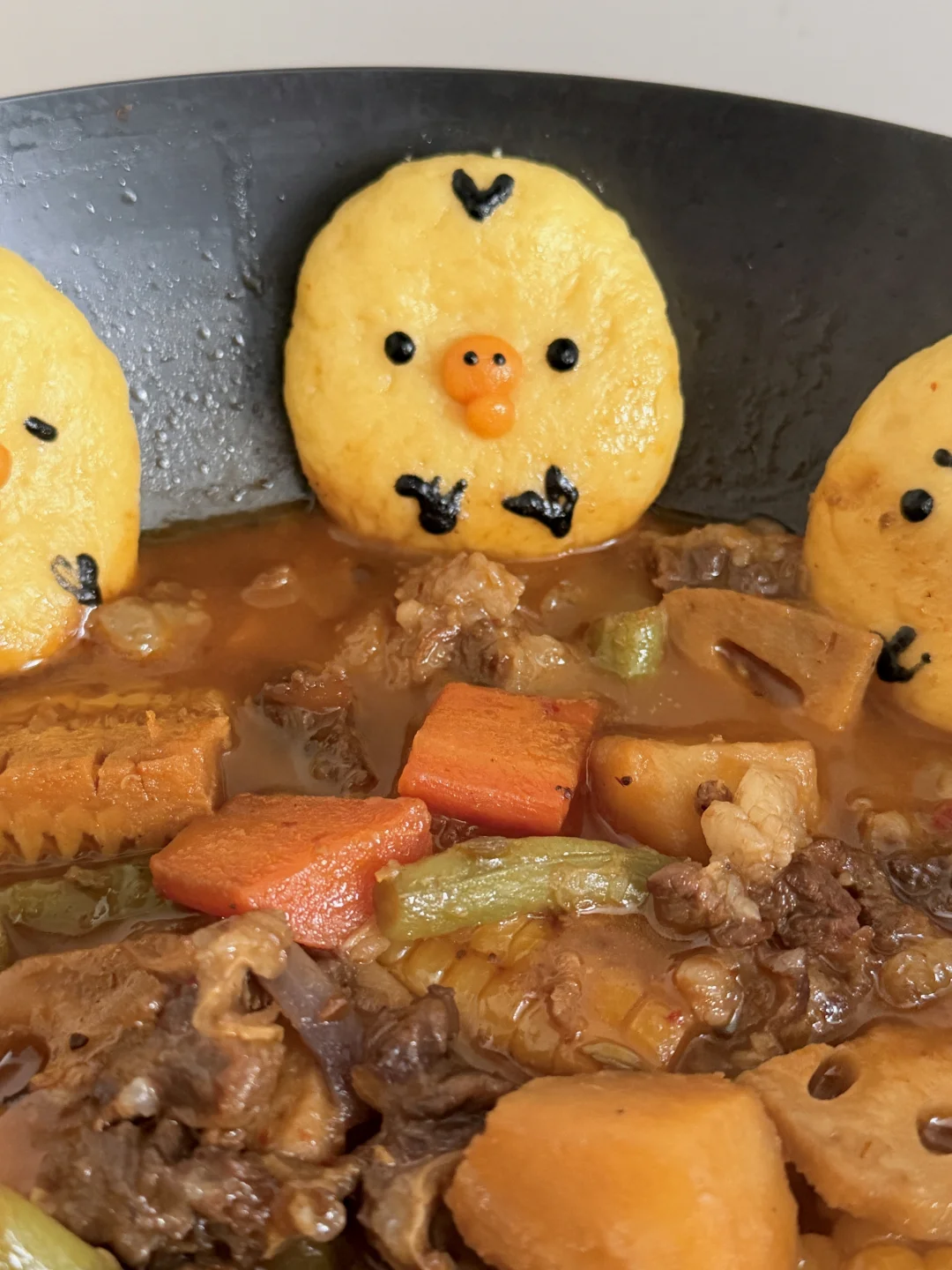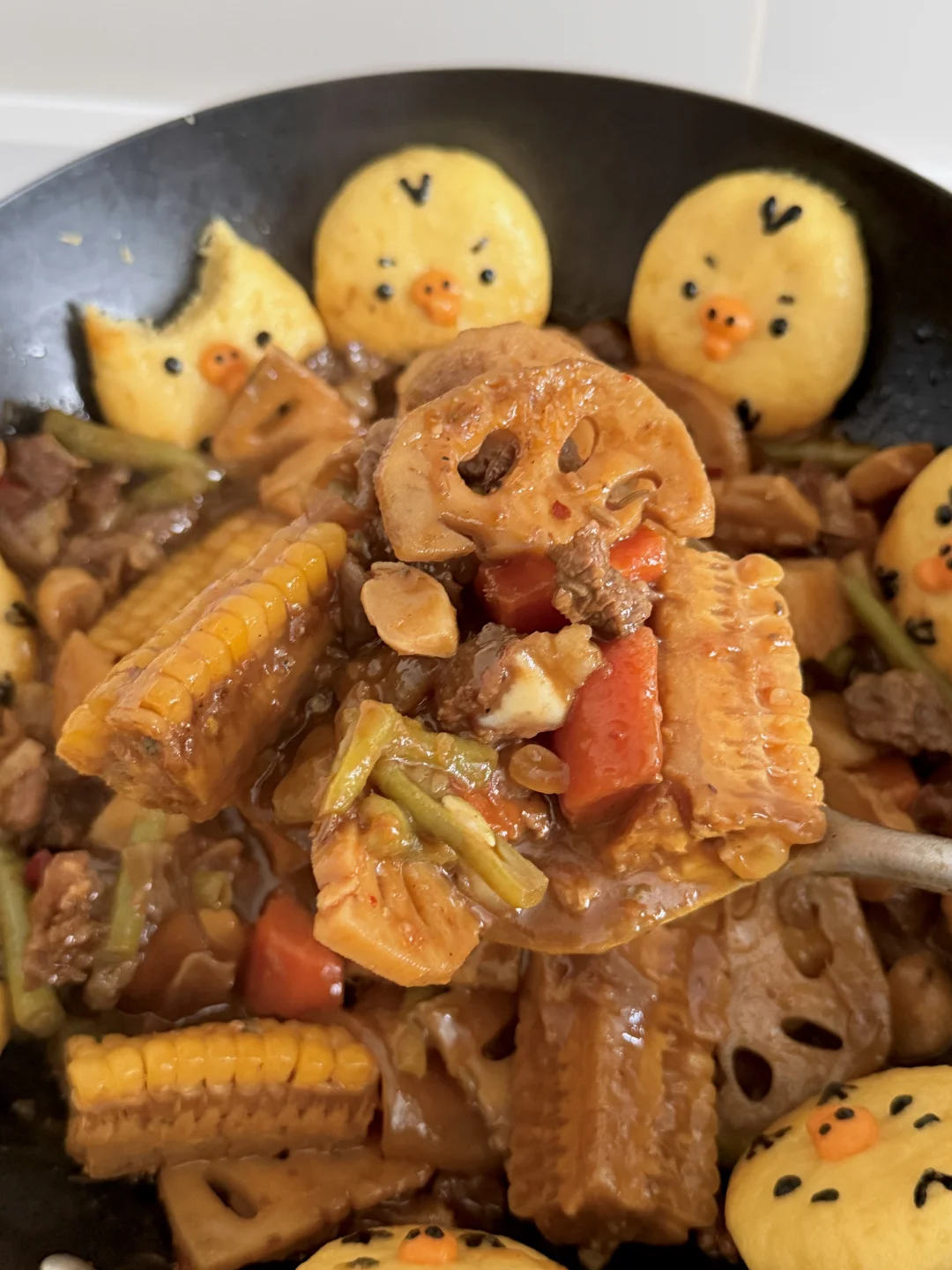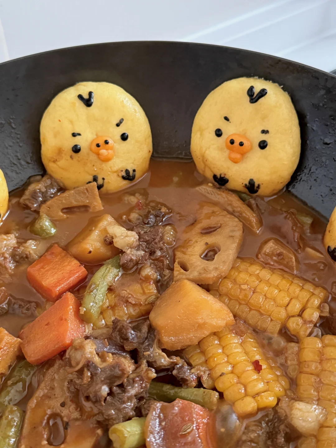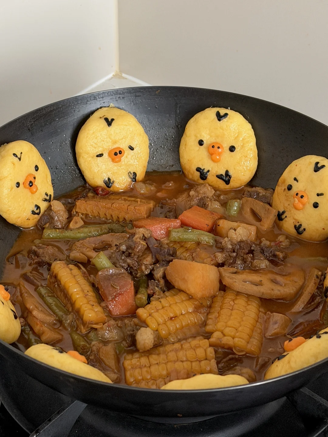 3️⃣玉米饼贴在锅边,加上细节,盖锅盖中小火继续十分钟左右即可出锅
