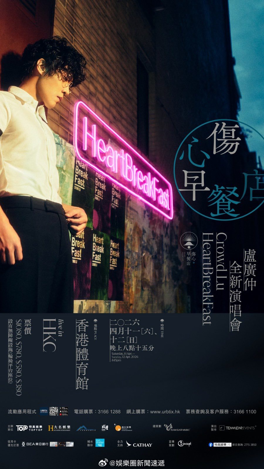 「(有視頻)卢广仲 ()4月紅館開唱..門票明早10時公售(附連結) … 大公文匯全媒體報道,「三金天王」盧廣仲全新主題演唱會《HeartBreakFast 傷心早餐店 》將於4月11至12日一連兩晚登陸紅館。優先訂票早前一經開售,火速搶空。今日(4日)主辦方官宣,將於明日(5日)上午10時於城市售票網公開發售,票價分為$1080/$780/$580/$380港元。粉絲們可以設好鬧鐘,準備撲飛!今次演唱會盧廣仲以最新專輯《HeartBreakFast 傷心早餐店》為主題,化身「傷心調酒師」,將失戀、孤單、成長等日常情緒化為溫暖旋律,將帶來多首金曲等,呈現療癒系現場體驗。2024年盧廣仲紅館「勵志的演唱會」曾因檔期僅開一場、歌迷直呼「不夠」後,今年加開至兩場,相信可以滿足小隊員們的期待..」入內看視頻及全文:网页链接 即时娱乐新闻 娱乐圈 音乐 乐坛 演唱会 .. 香港
