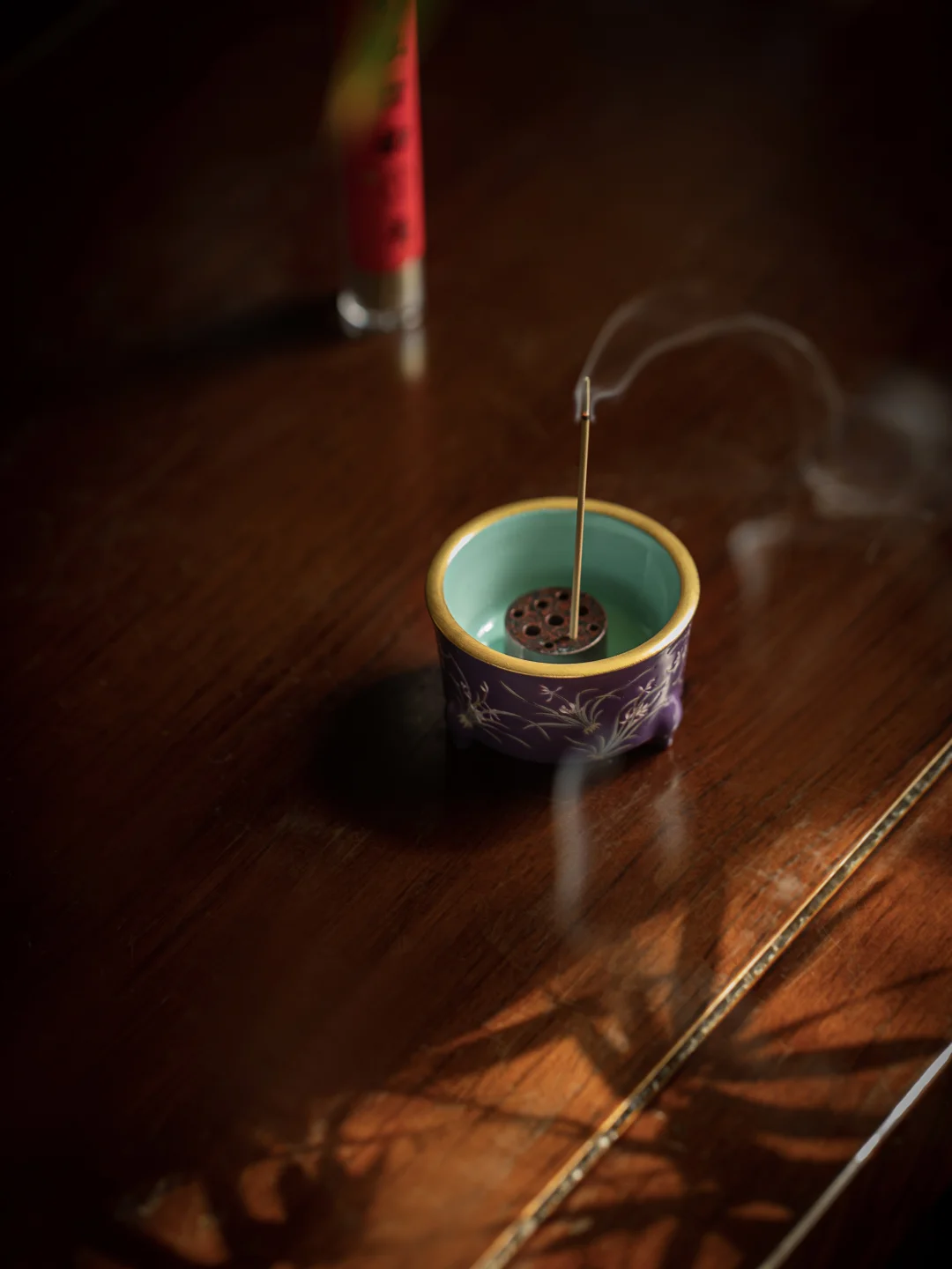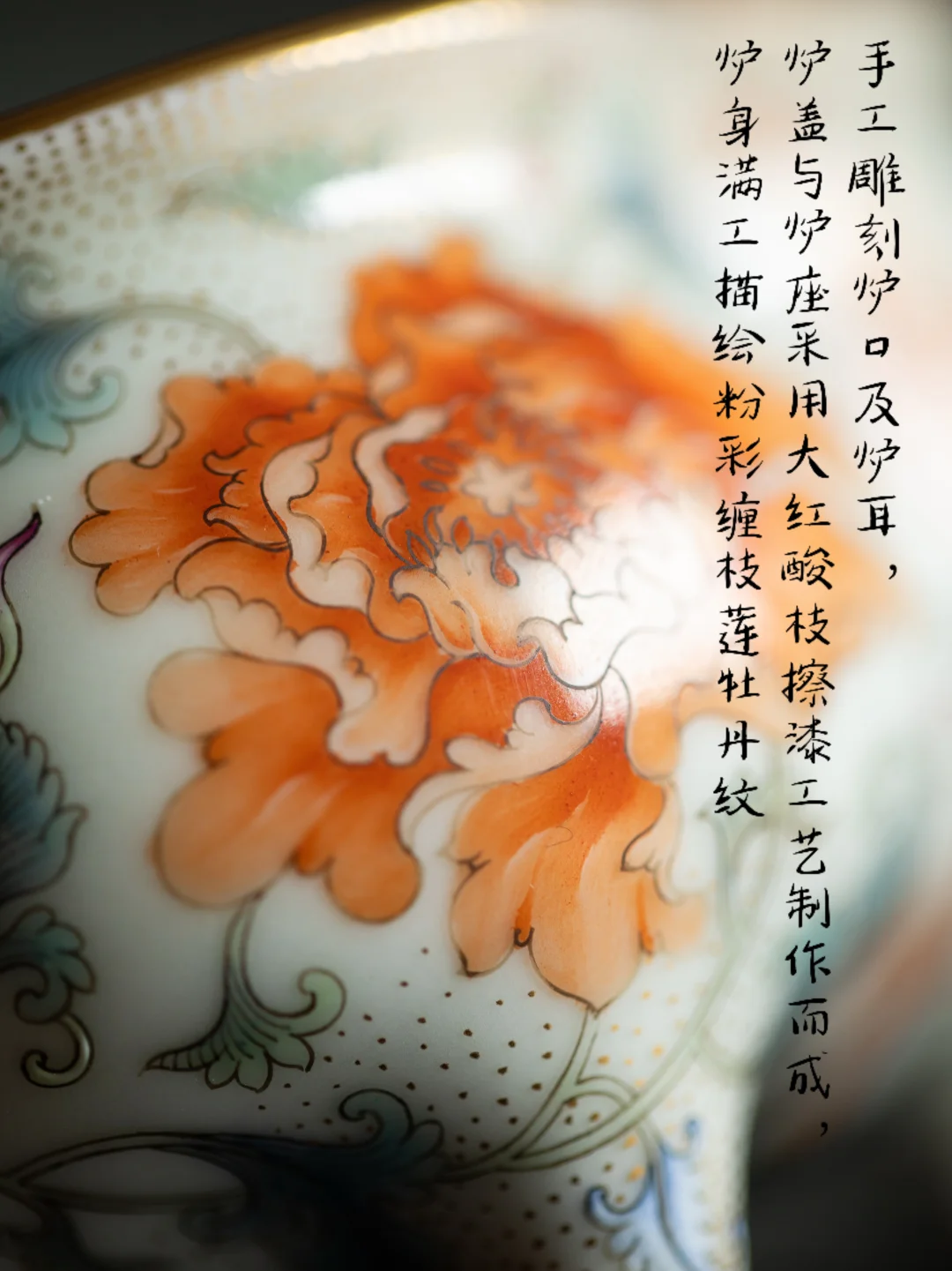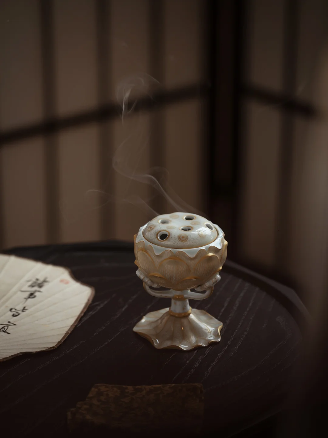 莲花开在炉身,描金勾勒出叶脉的走向。它是佛前供花的旧器,也是寻常人家案头的清供。点一炉香,仿佛也借了几分莲台的圣洁,连呼吸都变得庄重起来。