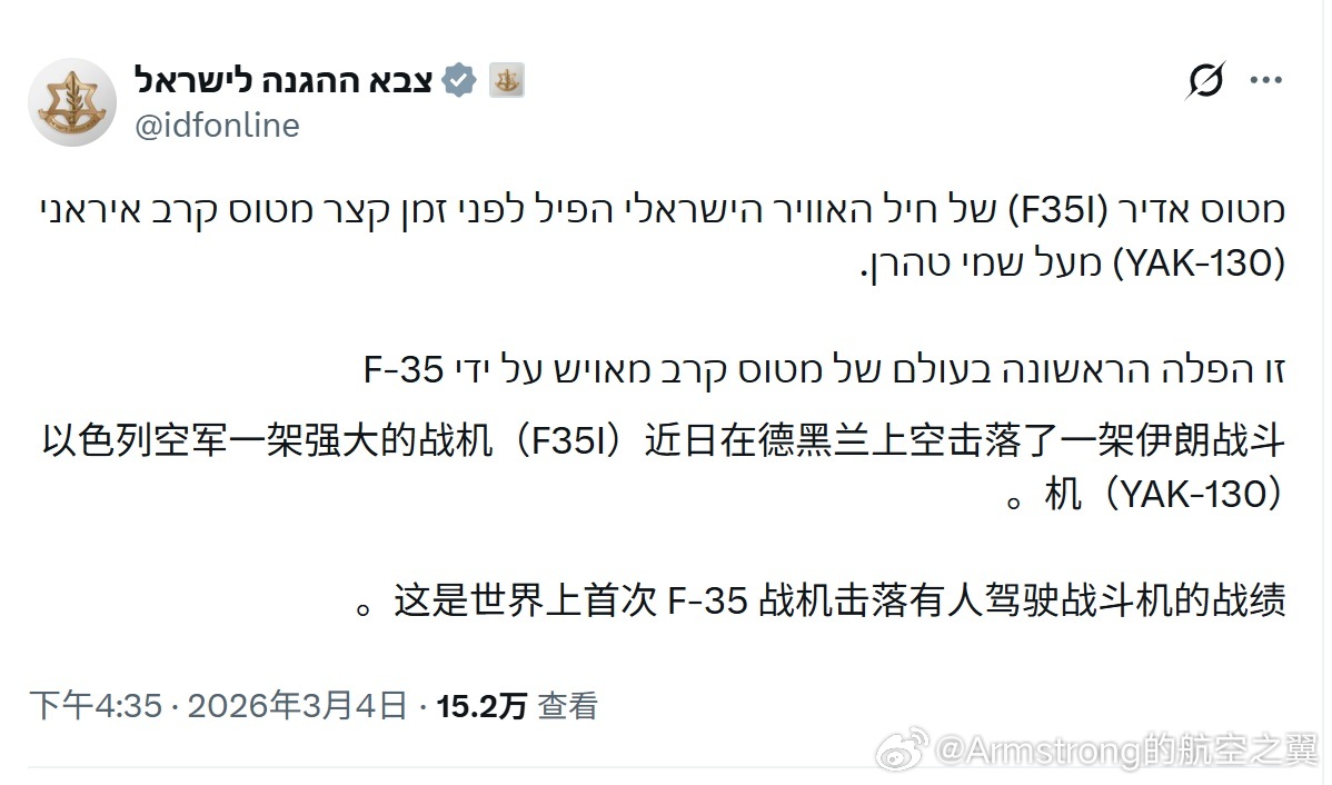 中东局势彻底失控 美以伊最新局势 以色列国防军称,在以色列空军轰炸德黑兰期间,一架F-35I “阿迪尔” (Adir) 隐身战斗机击落了一架试图升空拦截的伊朗雅克-130战斗教练机。