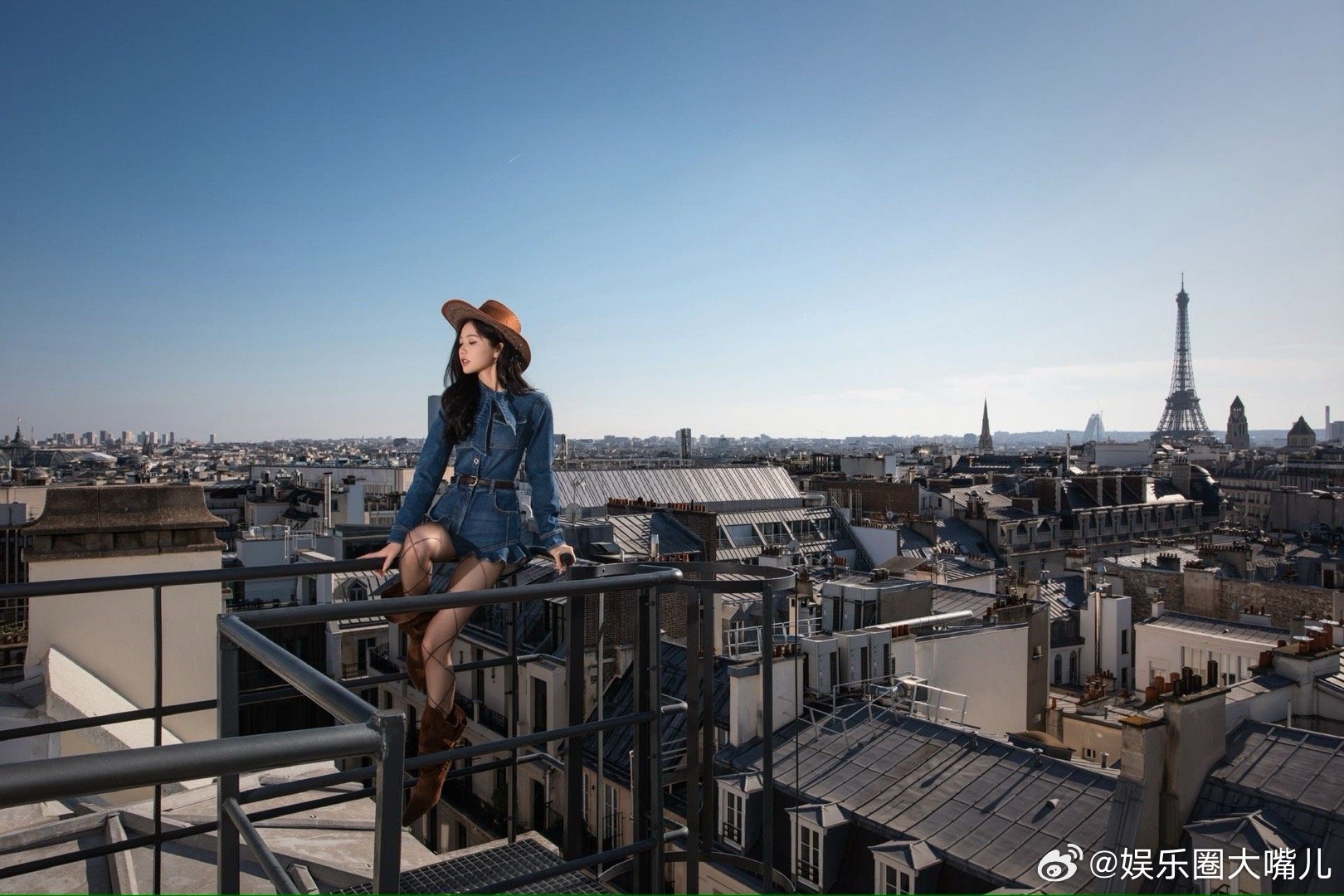 岳雨婷时装周街拍大事很妙 牛仔装束在巴黎街头意外地搭,站在斑驳的屋顶上,身后是永
