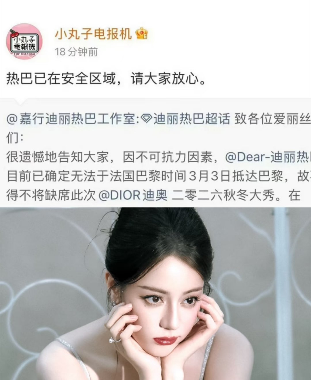 迪丽热巴报平安热巴已离开中东地区!悬着的心终于放下了😭热巴平安归来这几天,全网都在等一句“平安”。从揪心等待到确认她已安全离开中东,进入安全区域,悬着的心终于放下了😭比起时装周、红毯、高光时刻,我们最想要的,从来都是你平平安安。光环再耀眼,都比不上你安然无恙更珍贵。你只管好好照顾自己,不必逞强,不必抱歉,平安归来,就是最好的消息。往后岁岁年年,愿你所行皆坦途,所遇皆温暖,永远被平安与温柔包围✨