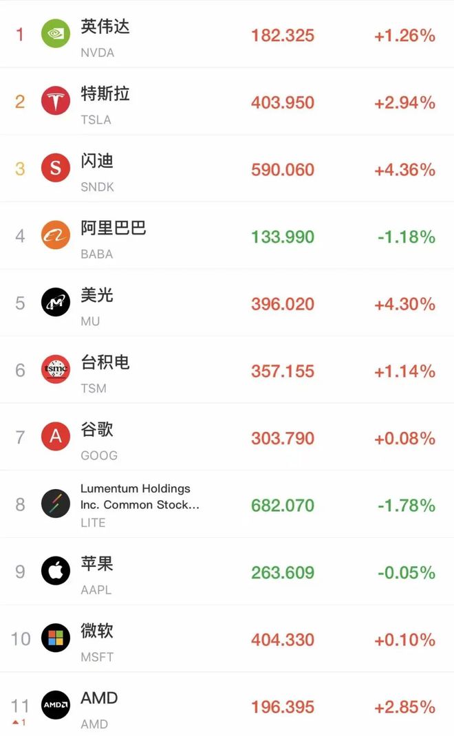 科技股普遍反弹走高,美光科技、闪迪涨超4%,特斯拉、亚马逊涨近3%,英伟达涨超1%。