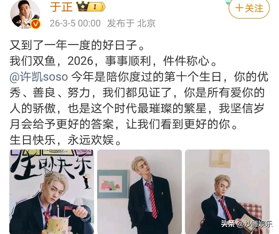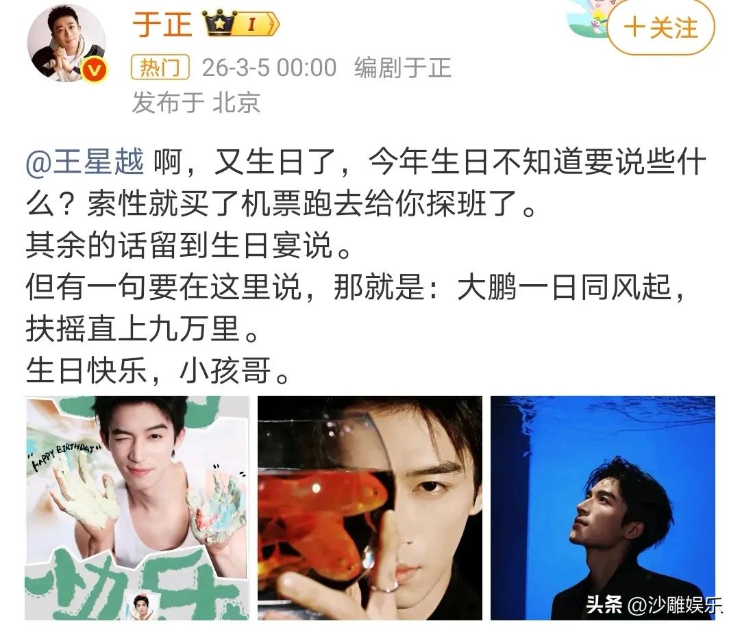 于正,凌晨连发两文! 3月5日凌晨,当大多数人还在梦乡,娱乐圈的“工作狂”于正准时上线。他卡着点为旗下两位艺人送生日祝福,只不过这波操作,被眼尖的网友看出了“亲疏有别”,直接冲上了热议话题 。 3月5日是个好日子,既是许凯的生日,也是王星越的生日。作为欢娱影视的大家长,于正自然不会缺席。凌晨时分,他连发两博。 针对老板兼“大家长”于正的发文,网友的评论也分成了两大阵营。 对于许凯,于正走的是 “回忆杀”路线。他细数了从《朝歌》到《烈火军校》等共同合作的作品,深情表白:“今年是陪你度过的第十个生日,你的优秀、善良、努力,我们都见证了。” 这措辞,像极了老父亲看着争气的儿子 。 而对于正当红的小生王星越,于正则显得更“行动派”。他直言不知道说什么,索性直接买了机票飞去剧组探班,还引用了李白的金句:“大鹏一日同风起,扶摇直上九万里。” 最后还跟了个时髦的称呼 “小孩哥”。 仔细品这两篇博文,信息量巨大,堪称 “老板心水图鉴”。 1. 称呼的微妙差异:叫许凯是亲切的“soso”,甚至省略了姓;叫王星越是全名加“小孩哥”。一个像自家兄弟,一个像看好且宠爱的晚辈。 2. 庆生方式的“云与泥”:对许凯是“回忆过去、展望未来”的云祝福,虽然真挚但略显公式化;对王星越则是不废话直接“打飞的去现场”的实际行动。有网友调侃:“这不就是异地恋和随时可见面的区别吗?” 3. 文案的走心程度:给许凯的文案明显更长更正式,用了很多岁月沉淀的词;给王星越的则更随性、更像朋友圈即兴发挥。 网友辣评: “于正对许凯像是老夫老妻,对王星越像是热恋期。” “笑死,于正也太真实了,谁红就往谁身边凑?不过飞去探班确实很暖。” “只有我觉得于正对许凯才是真爱吗?都第十年了,娱乐圈有几个十年?这种细水长流的支持才珍贵。” “心疼一秒许凯,老板都不飞过去看他。但转头一想,soso那个大老板,没准不想让于正去‘监视’呢哈哈哈。” 其实,无论是对许凯的深情告白,还是对王星越的探班宠爱,于正都完美诠释了他作为老板的 “江湖气”和 “生意经”。 许凯作为已经能独当一面的大流量,于正给的是尊重和底气——“你尽管飞,我永远在身后”。这既是给许凯安全感,也是给外界看:看,我欢娱对艺人多长情。 而对王星越这位上升期的“太子”,于正给的是陪伴和热度。亲自去探班,既保证了“老板重视你”的话题度,又用一句“小孩哥”拉近了年轻网友的距离,营销嗅觉极其敏锐。 所以说,于正这哪里是“双标”,分明是 “精准投放” 。不管是哪种爱,能在这个浮躁的圈子里,记住每个孩子的生日并认真对待,至少在这一刻,他是个合格的老板。许凯的第十年,王星越的“扶摇直上”,期待欢娱这出大戏的下一集。