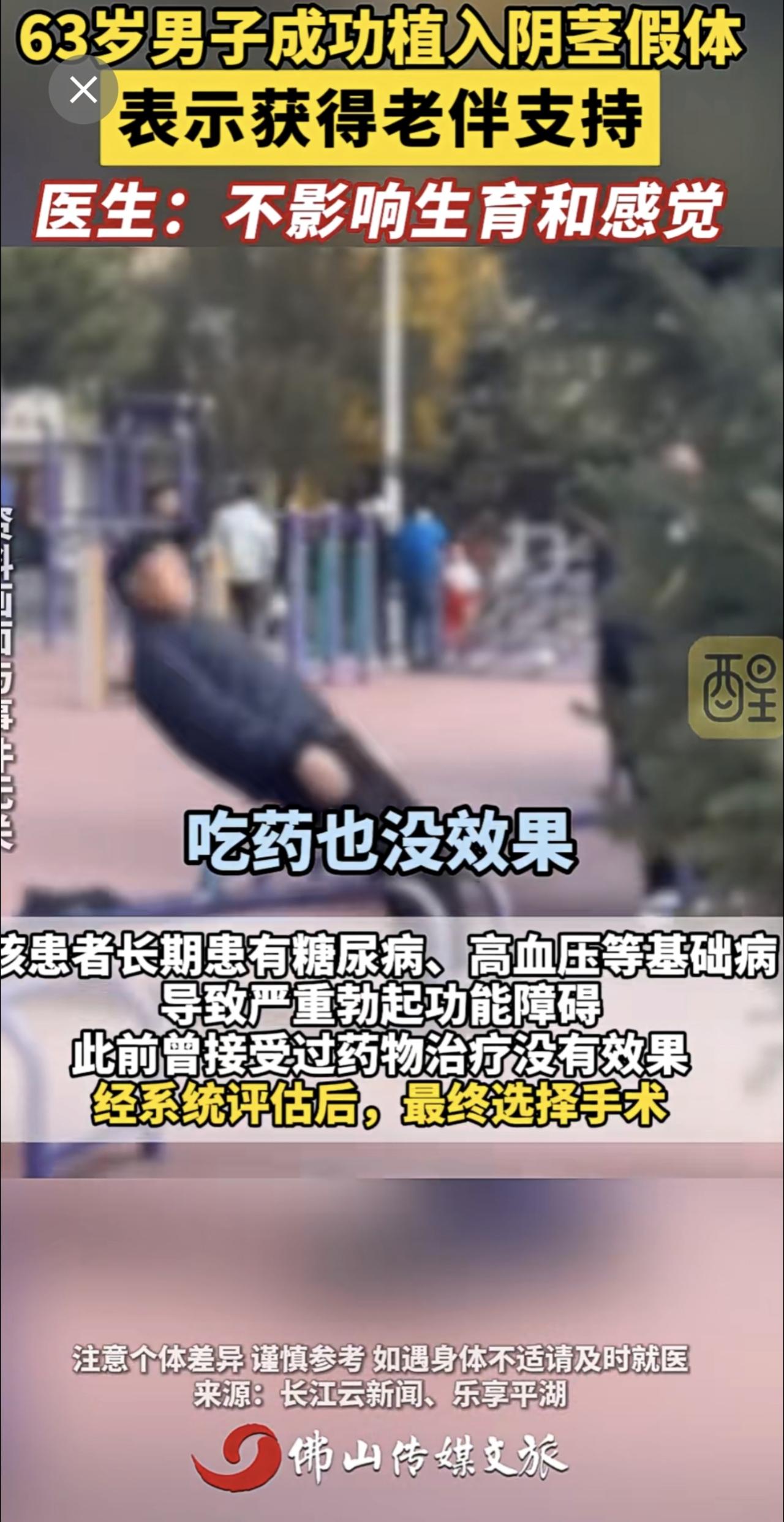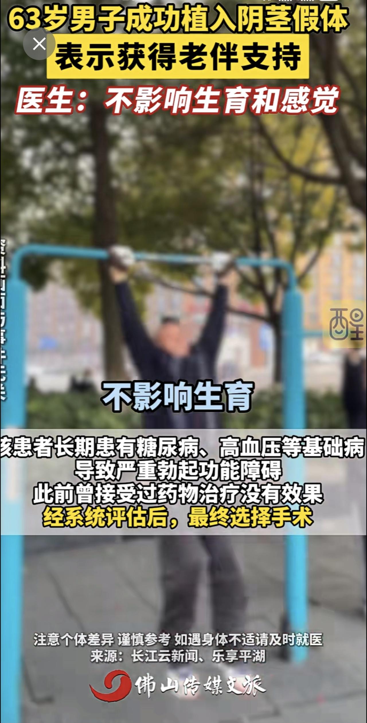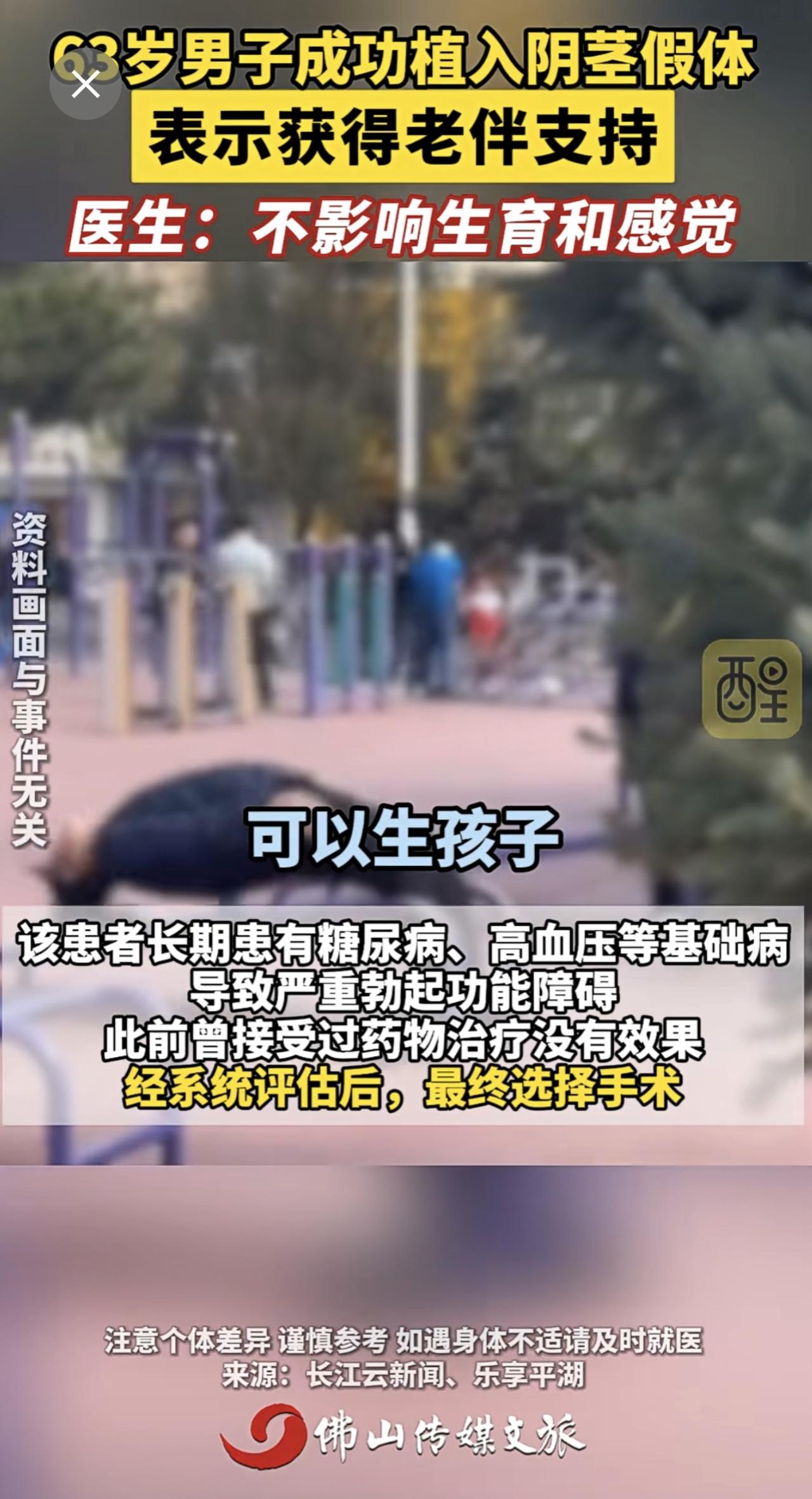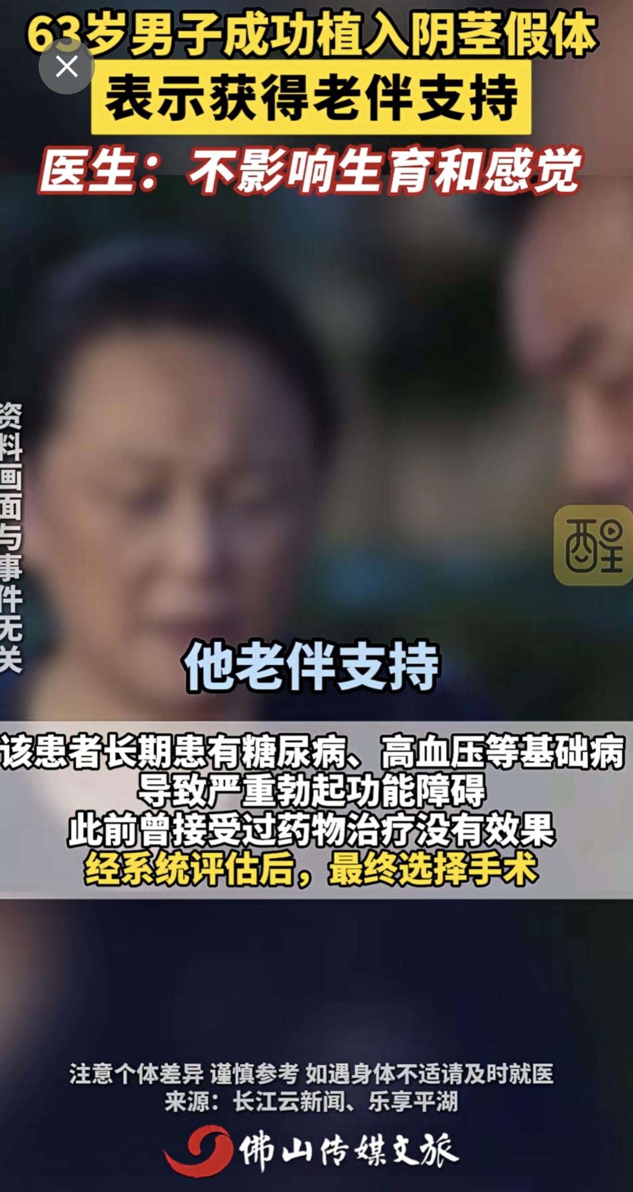 63岁男子成功植入阴茎假体,表示获得老伴支持。医生:不影响生育和感觉。(编辑:郭