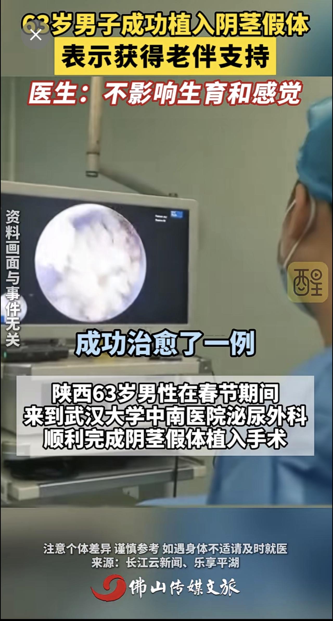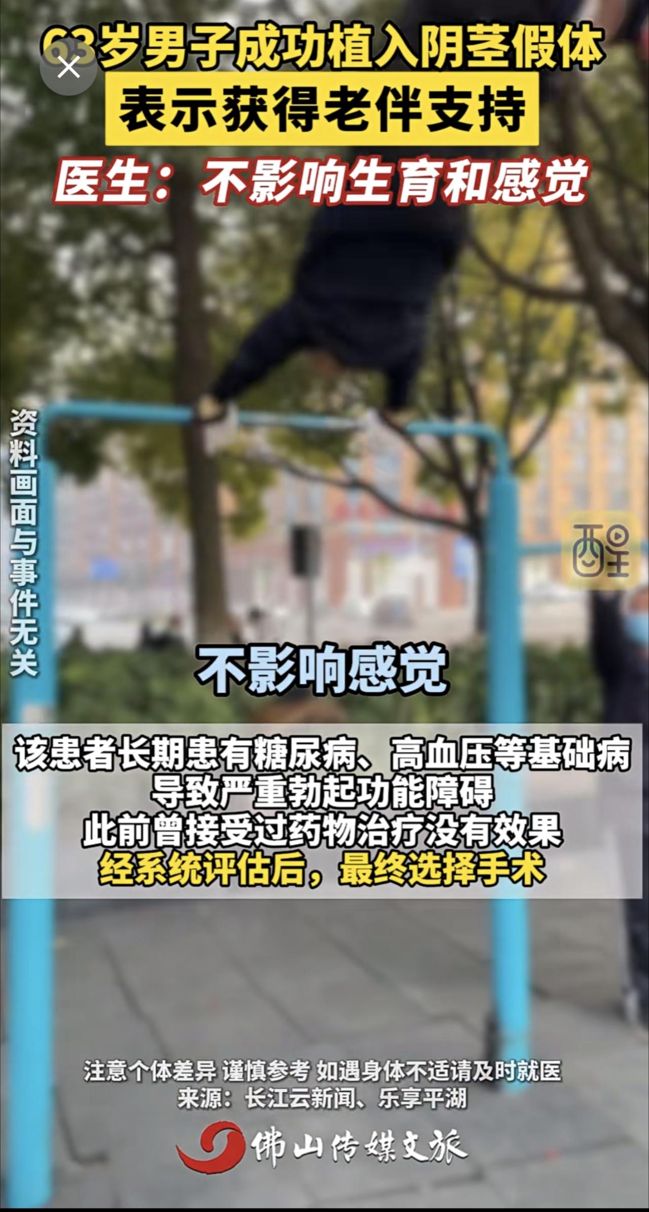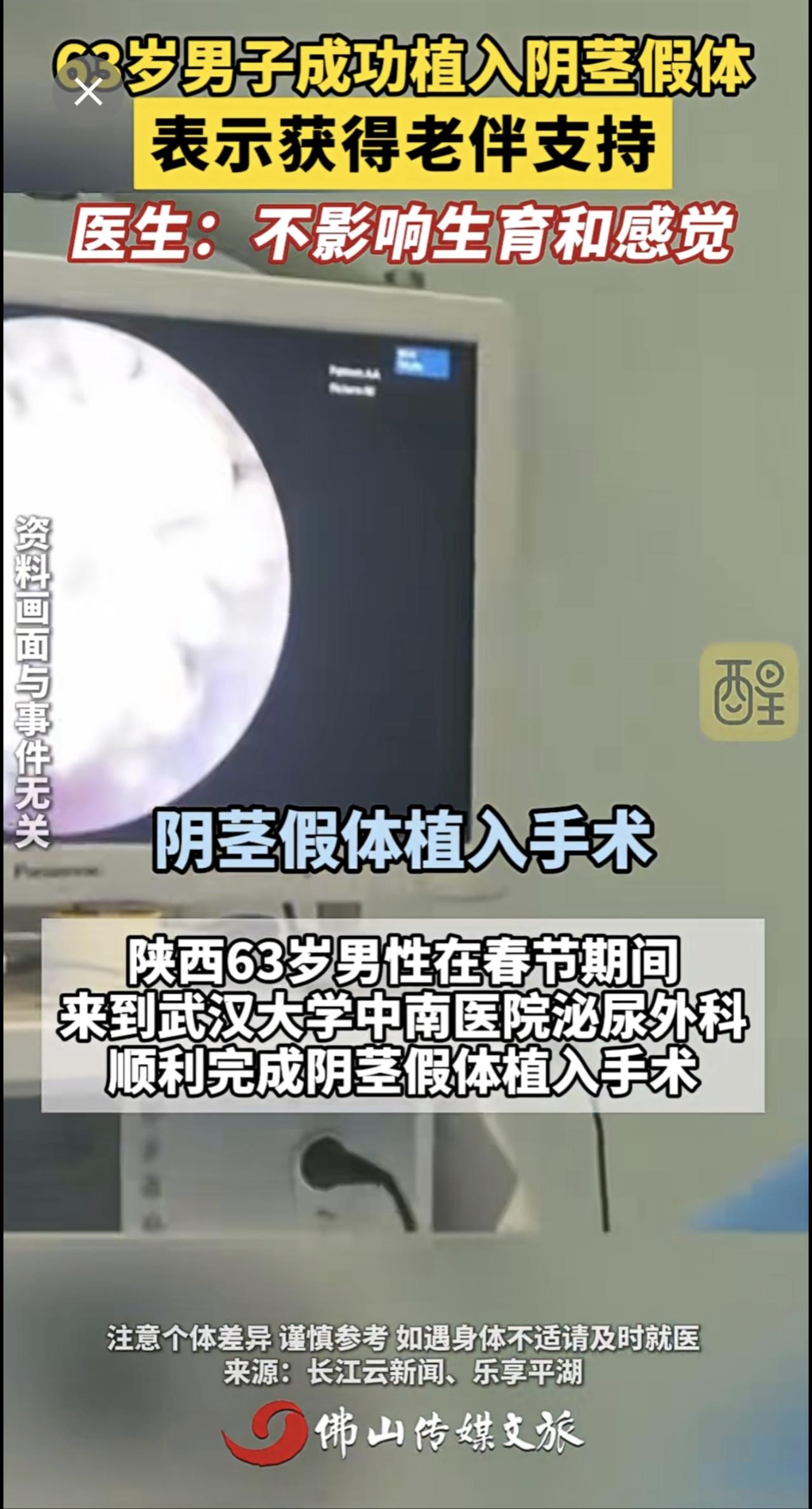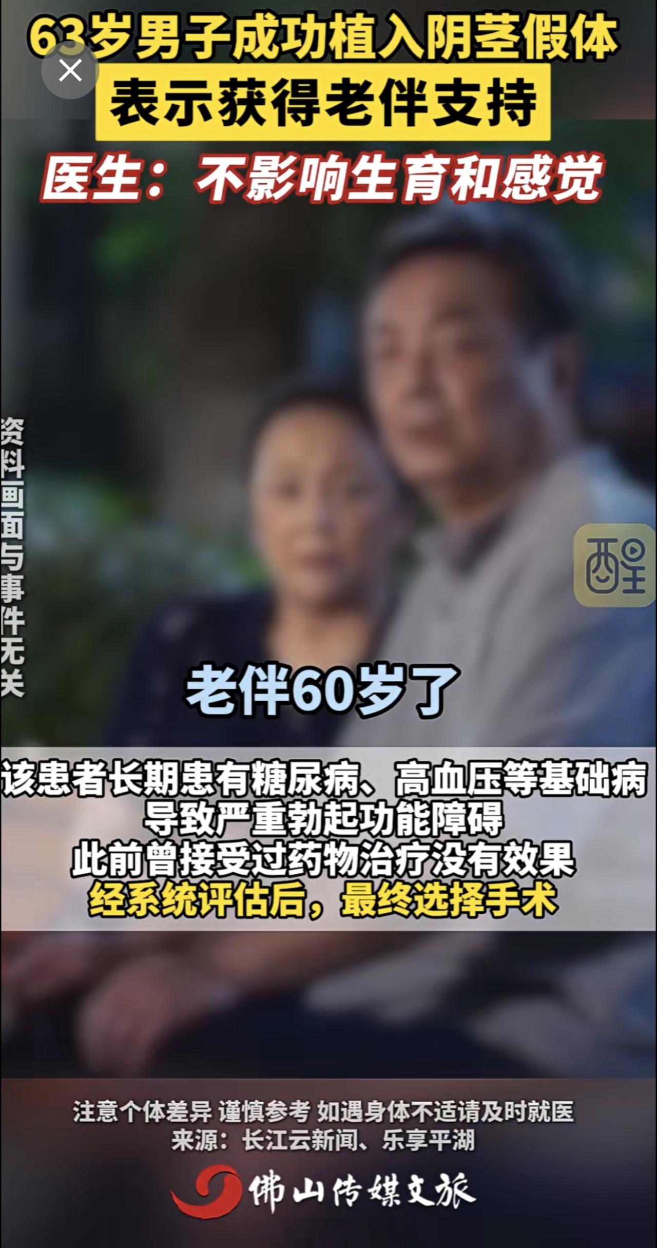 63岁男子成功植入阴茎假体,表示获得老伴支持。医生:不影响生育和感觉。(编辑:郭