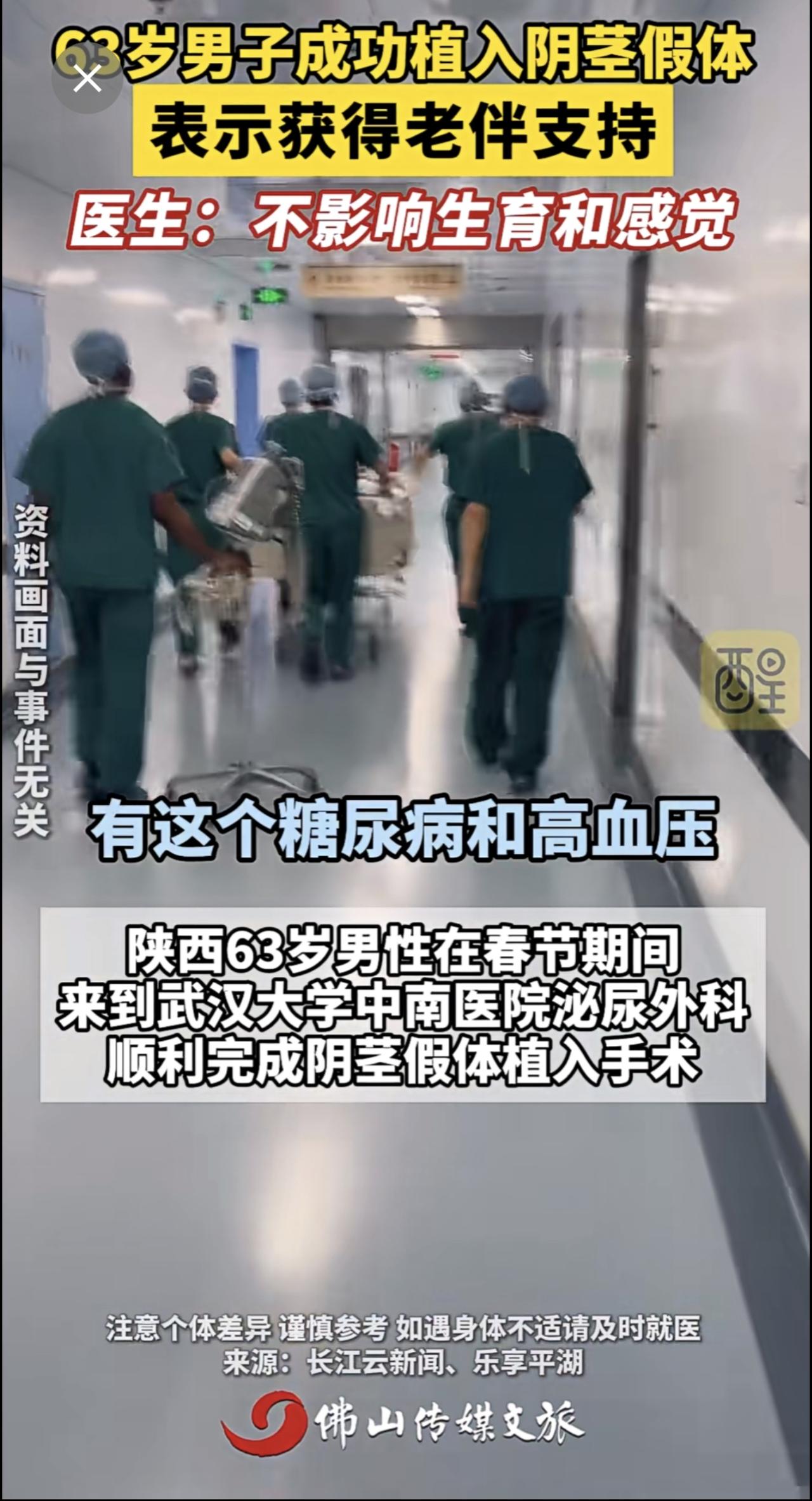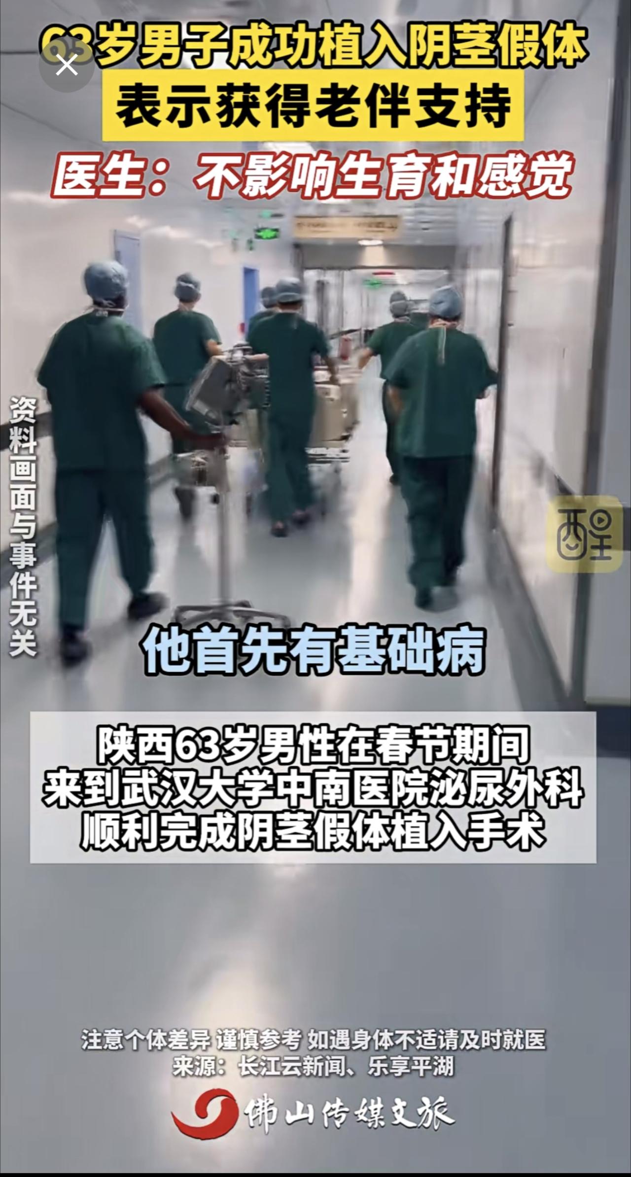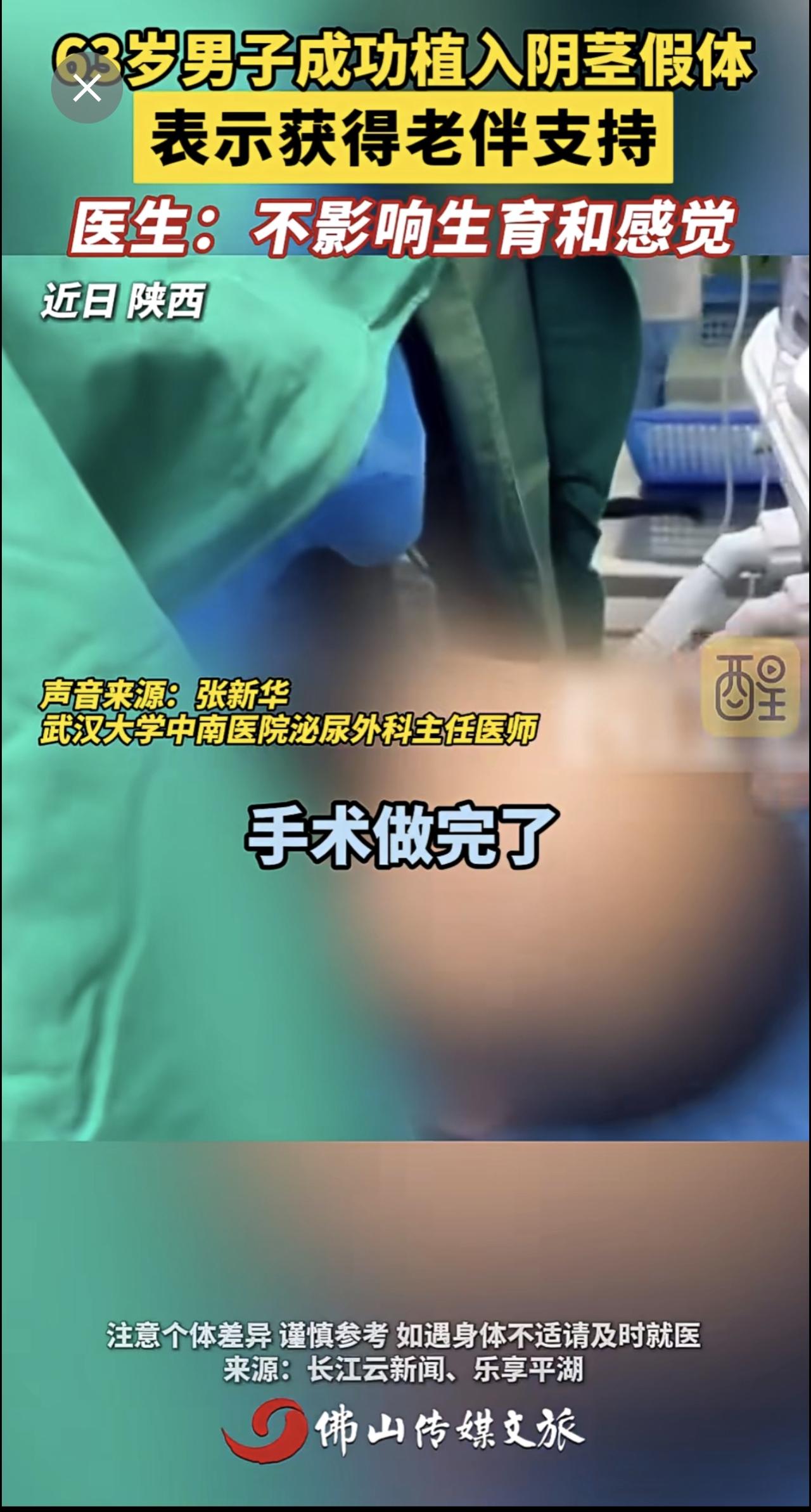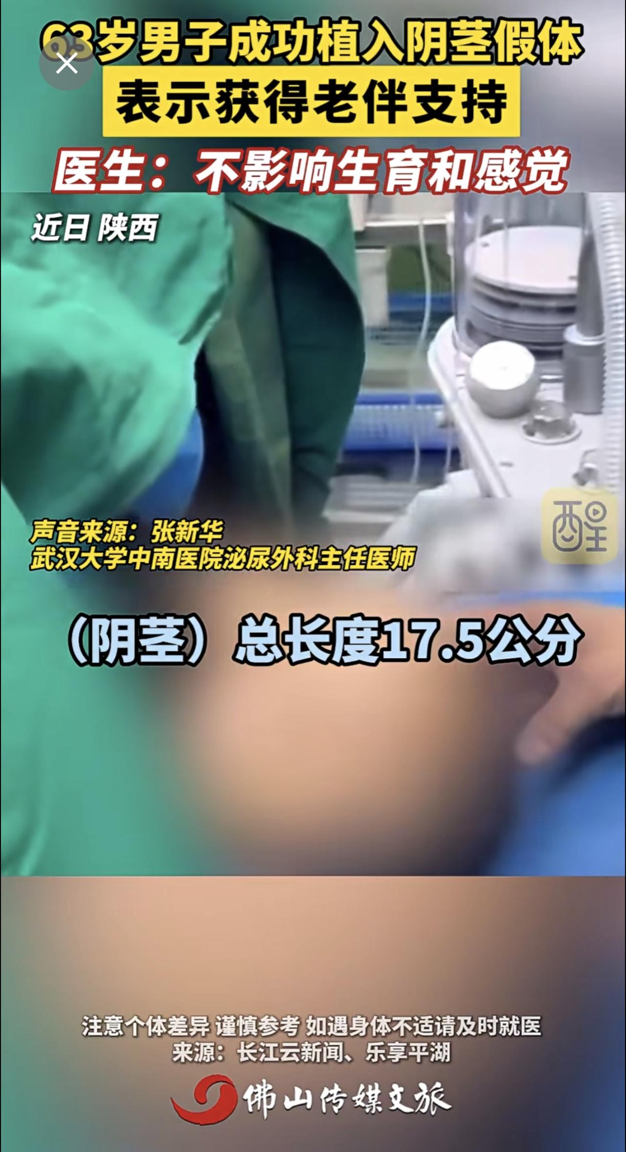 63岁男子成功植入阴茎假体,表示获得老伴支持。医生:不影响生育和感觉。(编辑:郭