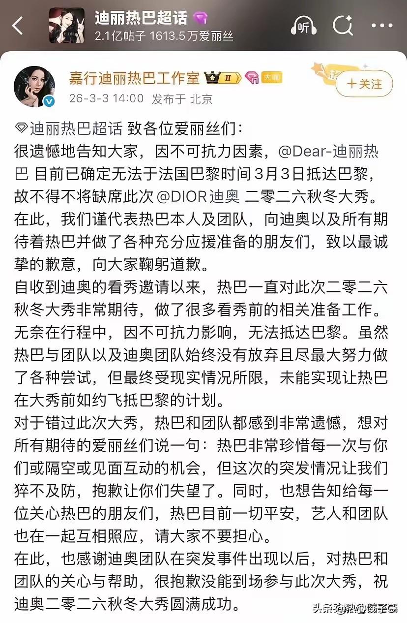 迪丽热巴工作室发文称:因不可抗力因素无法按时抵达法国巴黎,她将缺席迪奥时装周大秀。并告知关心她的朋友,她一切平安!有人说滞留在迪拜,明星的富贵普通人无法分享,明星的苦难却要普通人一起分担!不过希望在外中国人能平安回家!图片素材来自网上。