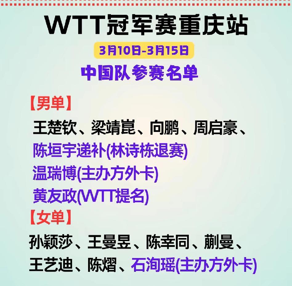 重庆冠军赛国乒名单大调整:林诗栋退赛休整,陈垣宇火线递补;温瑞博和石洵瑶获外卡,黄友政获提名 3月4日,2026年WTT重庆冠军赛官方公布了东道主外卡和WTT官方提名。 东道主外卡:温瑞博和石洵瑶 WTT官方提名:黄友政和安娜·赫尔希(威尔士) 另外,国乒林诗栋退赛休整,陈垣宇火线递补。林诗栋急需要一个休整,来放松身体,调整心态,重组战术,补强短板。不管是身体原因还是战略原因,这个休整特别及时,如果这个休整刚好是国乒整体“轮休”策略的一部分,那就最好了。比如一月王楚钦休整,二月梁靖崑休整,三月林诗栋休整,四月轮另外谁休整。 这样,重庆冠军赛国乒参赛人数从11人变成7男7女共14人。祝国乒取得好成绩。
