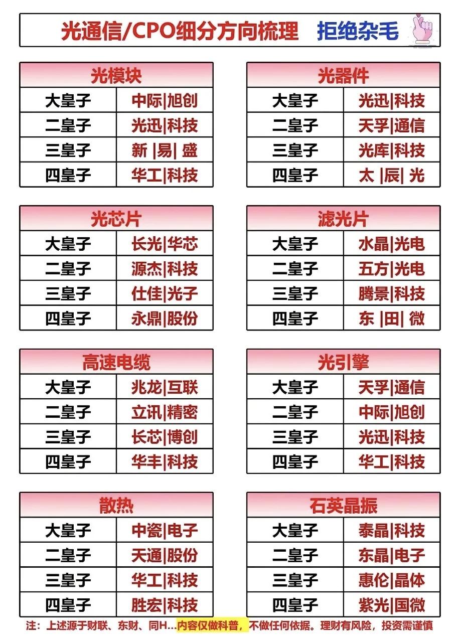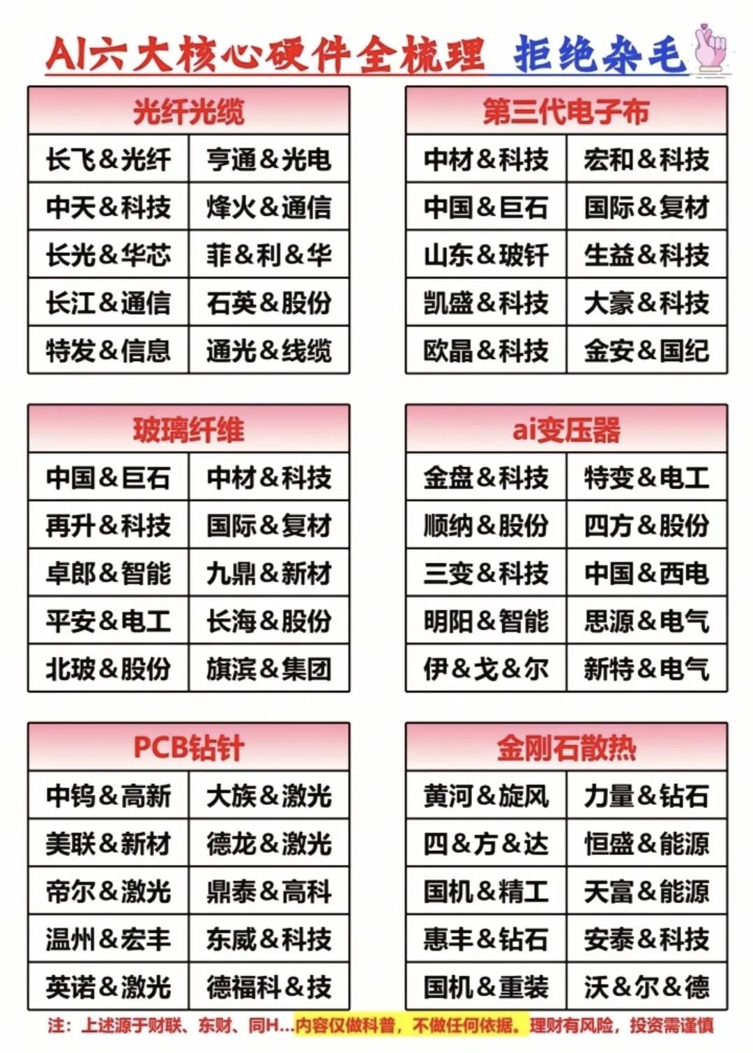 “十五五”开局之年,科技主线与高端制造的投资脉络已清晰!从太空算力、商业航天到可控核聚变,从AI核心硬件到电网设备全产业链,这几张图把未来几年的核心赛道和龙头标的梳理得明明白白。无论是光通信CPO的细分龙头,还是固态电池、脑机接口的前沿突破,都藏着下一轮行情的密码。收藏好这份硬核清单,紧跟政策东风,把握时代红利! AI算力爆发,光通信/CPO成核心赛道!这张图把光模块、光器件、光芯片等细分领域的龙头梯队梳理得清清楚楚,行业龙头代表中际旭创、光迅科技、兆龙互连、天孚通信等等值得关注。 AI浪潮席卷,核心硬件是算力底座!这张图把光纤光缆、AI变压器、金刚石散热等六大核心硬件赛道的龙头标的一网打尽,从上游材料到关键设备行业龙头代表有长飞光纤、中材科技等等。 ⚠️风险提示:以上内容仅作行业科普,不构成任何投资建议。市场有风险,投资需谨慎。