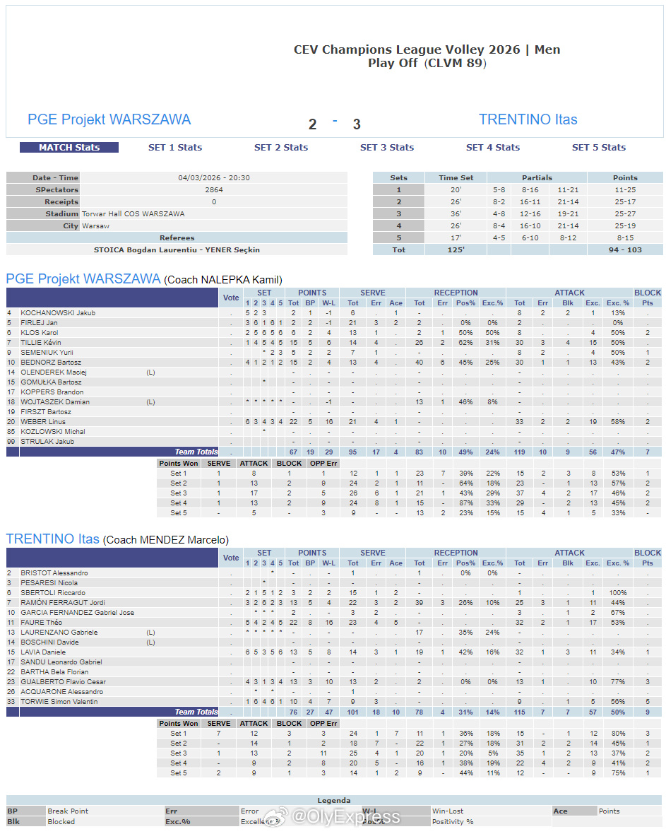 【欧冠男排特伦蒂诺3-2力克华沙 热舒夫轻取鲁瑟拉勒】国际排坛战报速递3月4日,欧冠男排八强附加赛首回合,意大利特伦蒂诺客场3-2(25-11/17-25/27-25/19-25/15-8)力克波兰华沙。弗雷22分、拉蒙、拉维亚和弗拉维奥各13分、托维10分,韦伯22分、蒂略和贝德诺兹各15分。波兰热舒夫主场3-0(25-16/25-20/25-18)轻取比利时鲁瑟拉勒。MVP斯扎尔普克16分、布特林12分、洛亚蒂11分,德姆奥克斯11分。